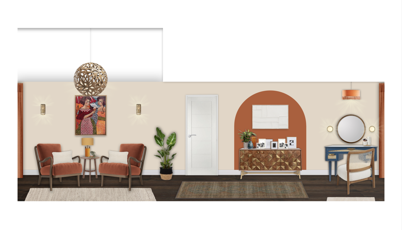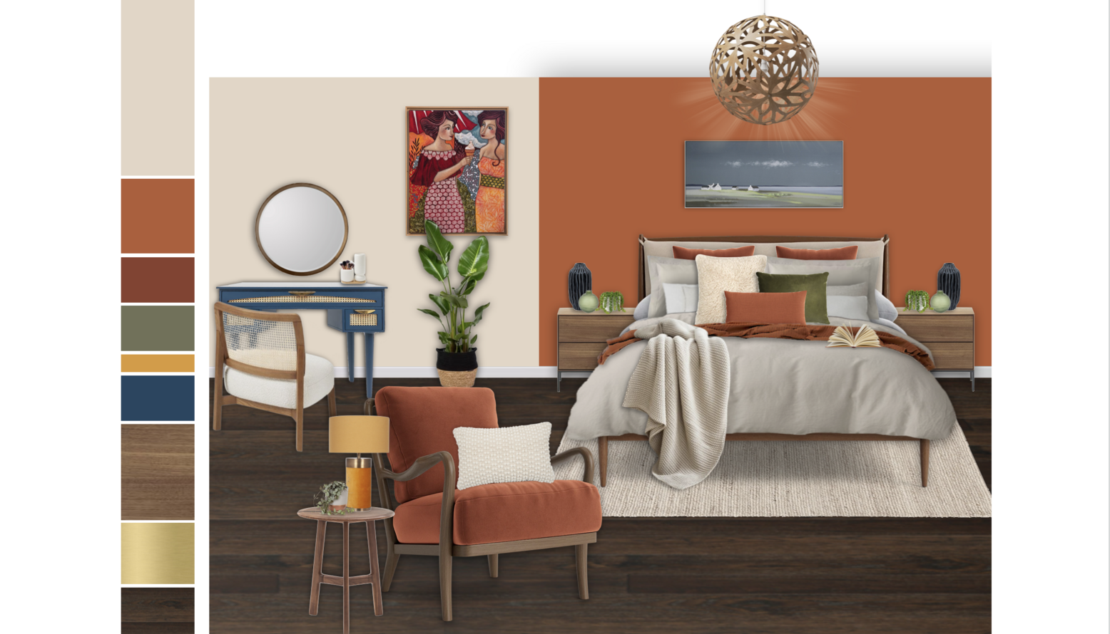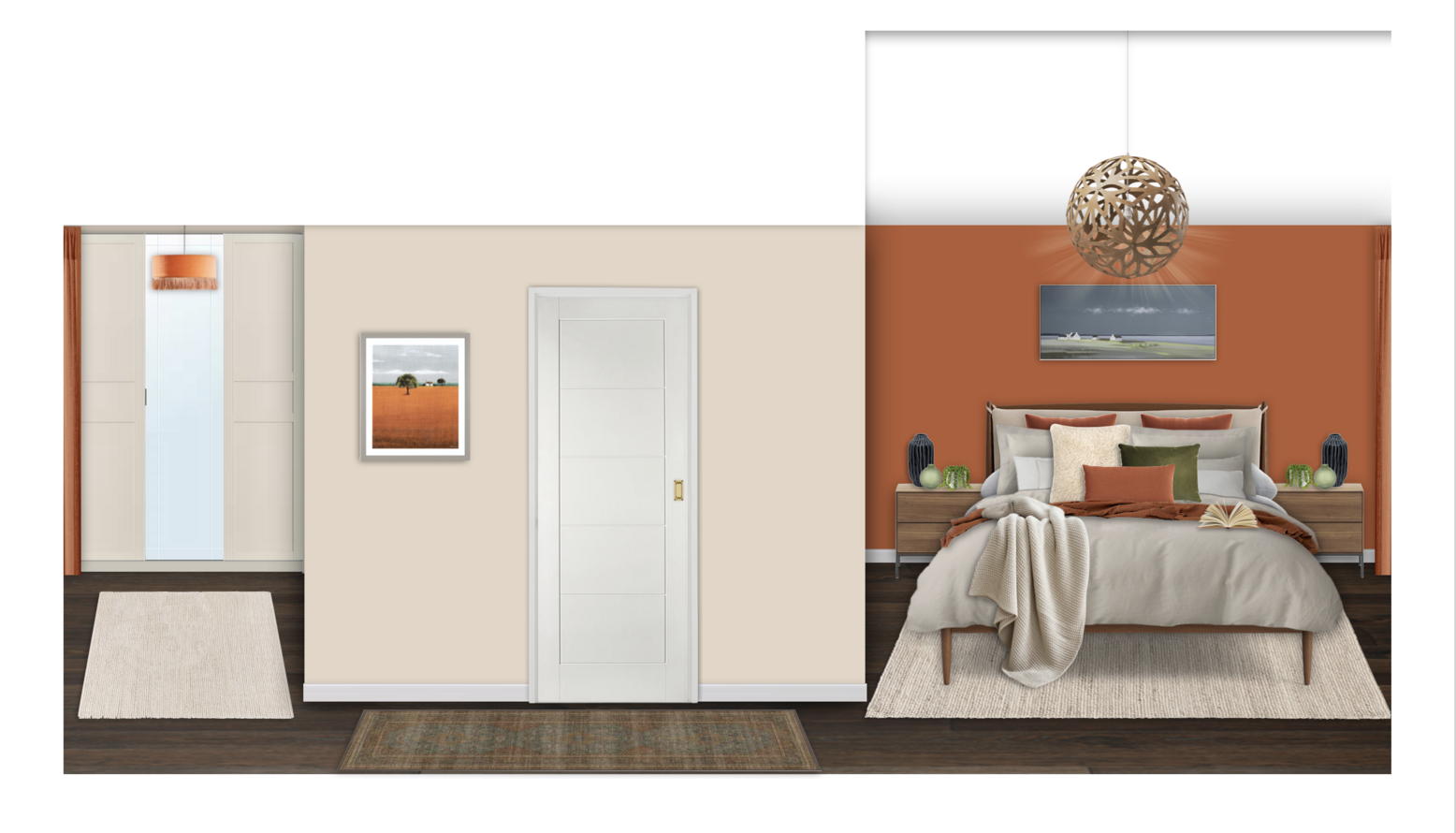 This beautifully designed bedroom and dressing room features a harmonious blend of colors and textures, creating a warm and inviting atmosphere. The focal point of the room is a striking accent wall in a deep orange hue, complemented by a soothing neutral palette on the other walls. The bed is elegantly dressed with a mix of plush cushions in various shades, including burnt orange, cream, and green, layered atop a soft beige duvet. A cozy throw in a warm tone adds an extra touch of comfort. Flanking the bed are sleek bedside tables featuring walnut veneer drawers, topped with tasteful decorative items and stylish lamps that provide ambient lighting. In one corner, a luxurious tufted accent chair in orange velvet invites relaxation, paired with a small, circular side table. The space is further enhanced by a vibrant piece of artwork above the bed, adding character and a personal touch to the decor. Richly textured rugs in cream and beige create a layered look on the dark wooden floor, anchoring the space effectively. Strategically placed plants bring a refreshing touch of nature indoors, while carefully selected window dressings in soft linens contribute to the room's tranquility. A beautiful, round mirror and a sideboard provide functionality while maintaining the aesthetic appeal of the room, ensuring every detail has been meticulously considered for both beauty and practicality.