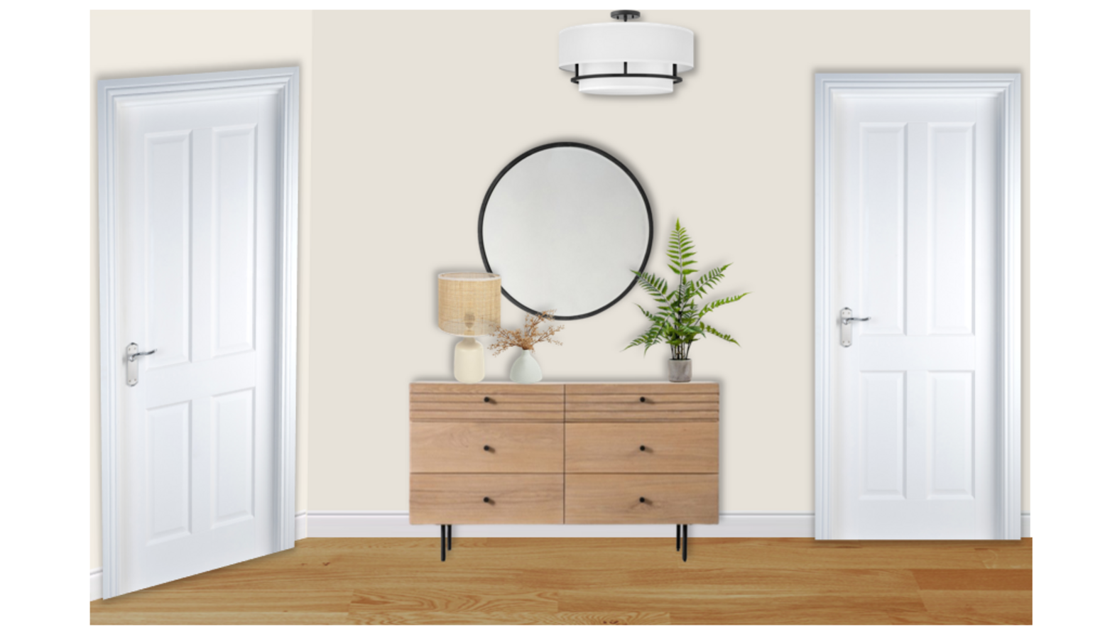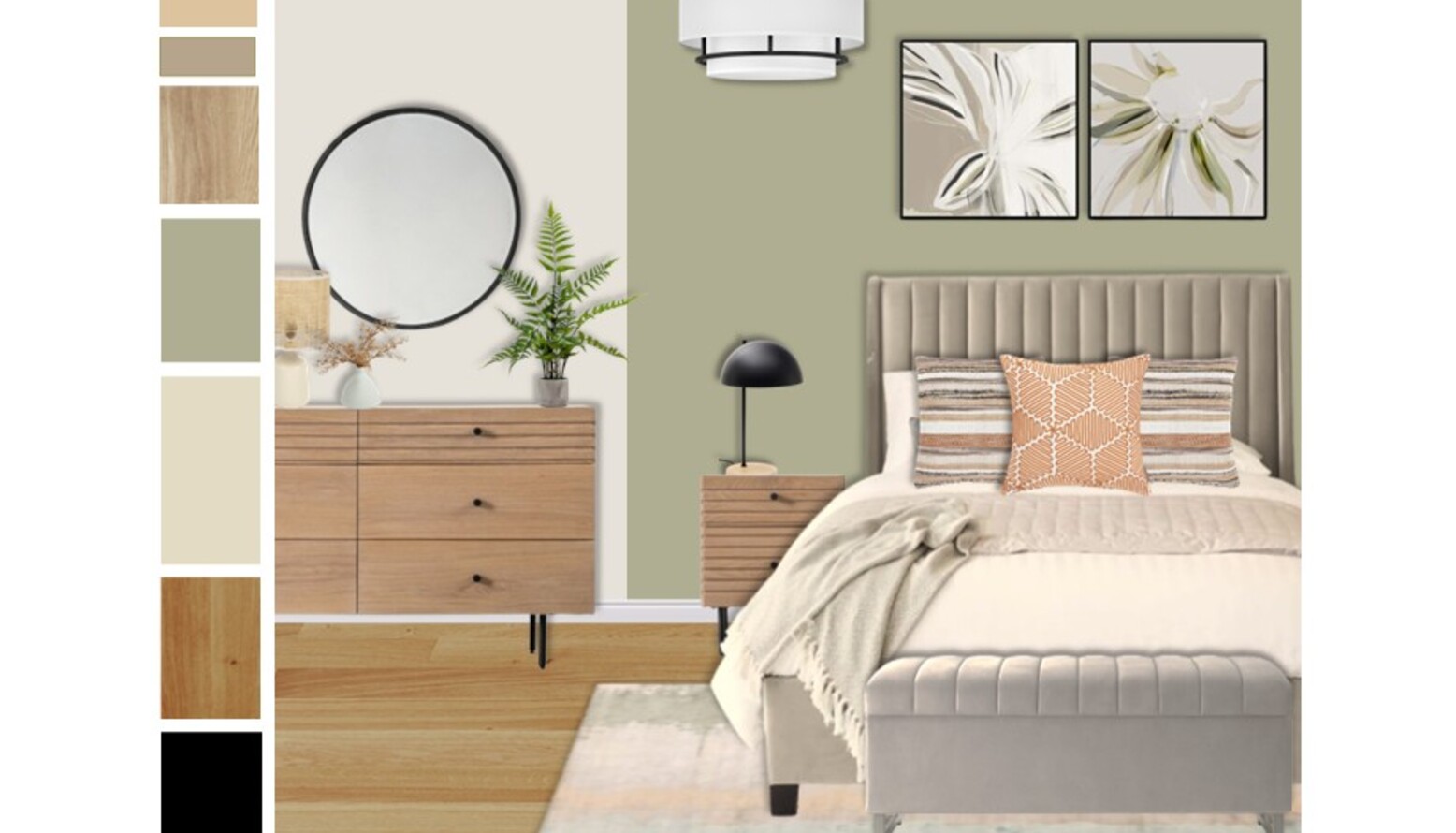 A mid-century modern chest of drawers sits adjacent to the bed, providing not just storage but also a touch of sophistication, further enhanced by a large round mirror above it, which visually expands the space. The walls are painted in a soothing green tone, perfectly contrasting the neutral elements while enhancing the calming atmosphere.