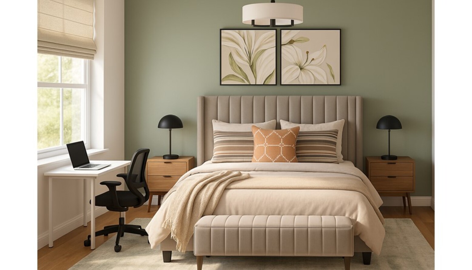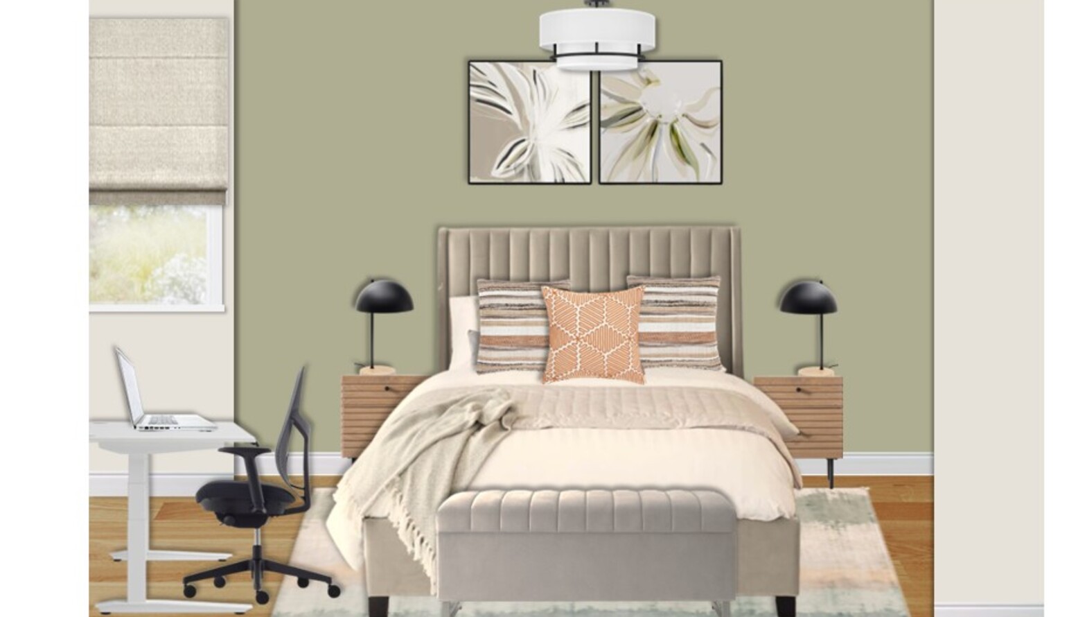 Artistic touches are found in the abstract wall art that introduces organic shapes and soothing colors, tying the room together beautifully. Faux plants add a refreshing vibe, while an adjustable desk and ergonomic office chair cater to potential work needs, blending functionality with style.