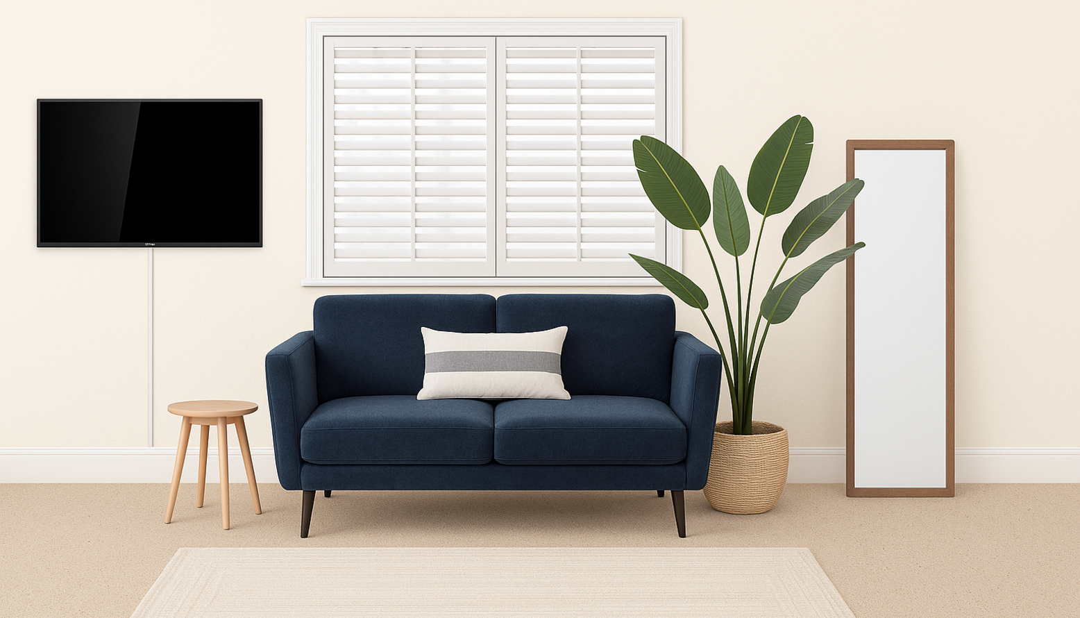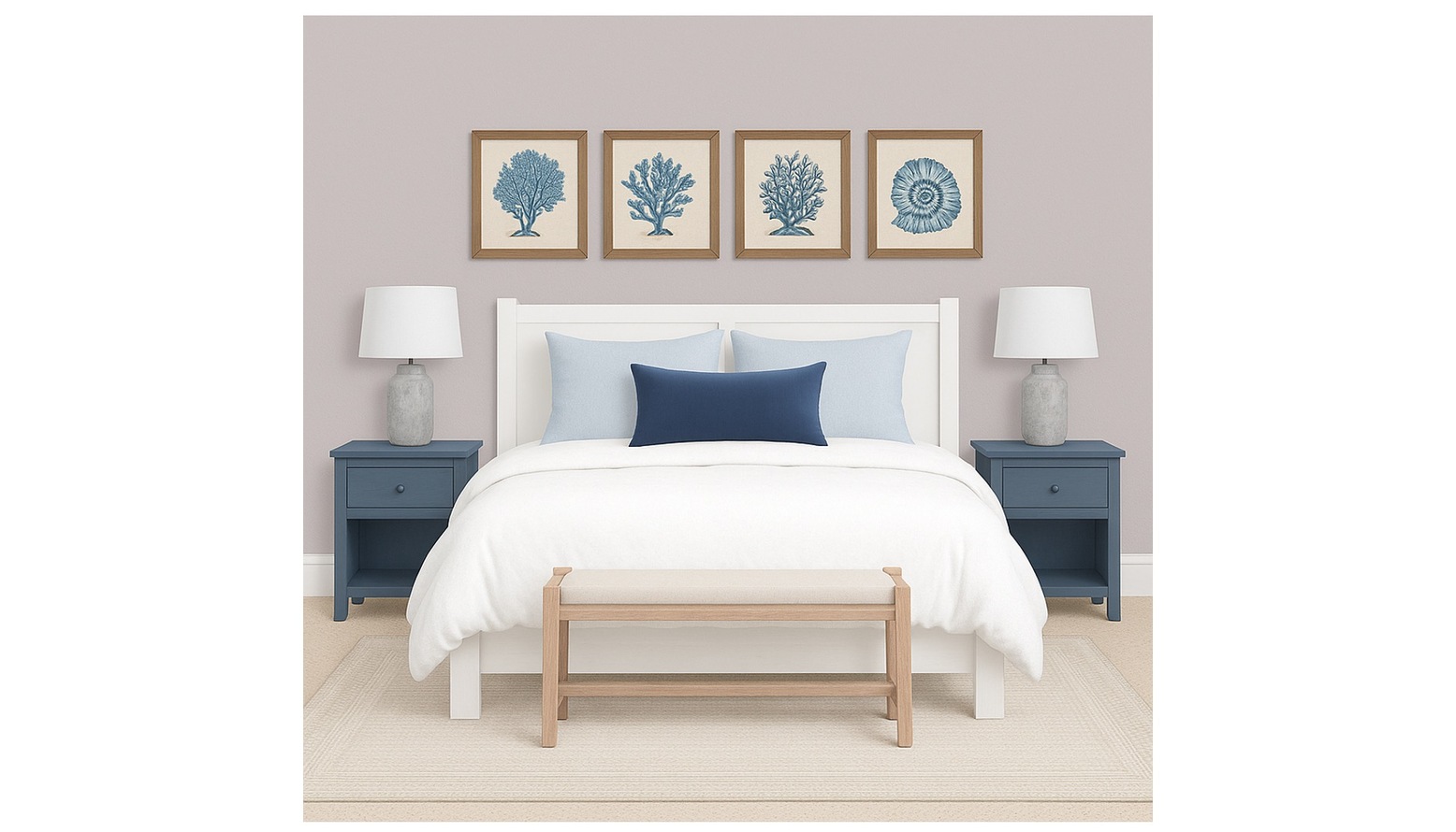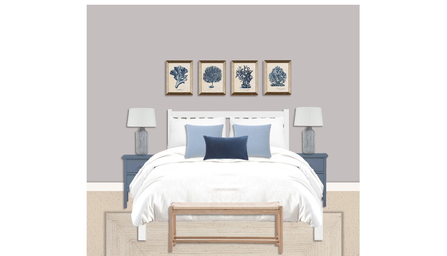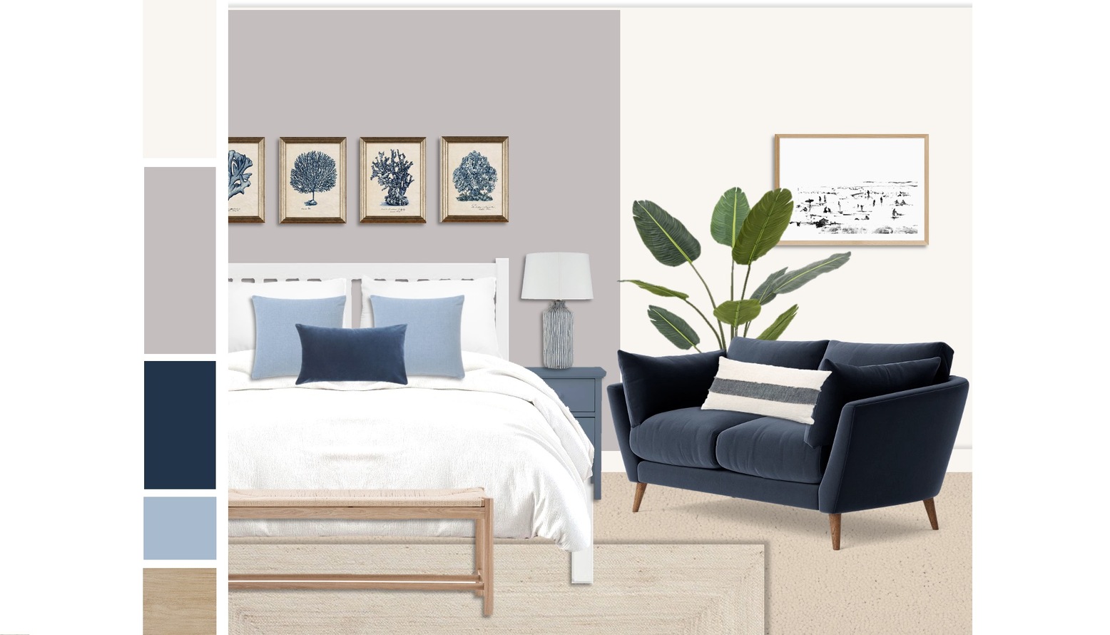 This bedroom design features a calming and elegant aesthetic, perfect for an Air BnB setting. The walls are painted in a soft, neutral tone, creating a serene backdrop that enhances the overall atmosphere. At the center of the room is the John Lewis Wilton King Size Bed Frame, finished in white, accompanied by a cozy white duvet that invites relaxation. Flanking the bed are stylish denim blue bedside cabinets, each topped with chic, minimalist lamps that provide gentle lighting. The bed is adorned with a mix of light blue and navy cushions, adding layers of texture and color. A natural wood bench is positioned at the foot of the bed, providing both function and a touch of warmth. The room’s flooring is softened by a Jute Rug in Ivory, which not only brings in a natural element but also complements the furnishings. Artwork featuring blue botanical prints hangs above the bed, adding visual interest while maintaining a cohesive color palette. This is further echoed in the selection of faux plants strategically placed around the room, enhancing the fresh and inviting ambiance. A tall Potted Travellers Palm Tree creates a focal point, drawing the eye upward and bringing life to the space. Reflecting elegance, a full-length Solare Mirror finished in oak is positioned thoughtfully, allowing for both functionality and decorative appeal. The wardrobe area is enhanced by a sleek side table and stool in natural finishes, contributing to the overall stylish simplicity of the room. Complementary decorative elements like the waste paper basket and lamp shade keep the functionality seamless throughout the design. Overall, the space balances comfort and style, ideal for guests looking for a relaxing retreat.