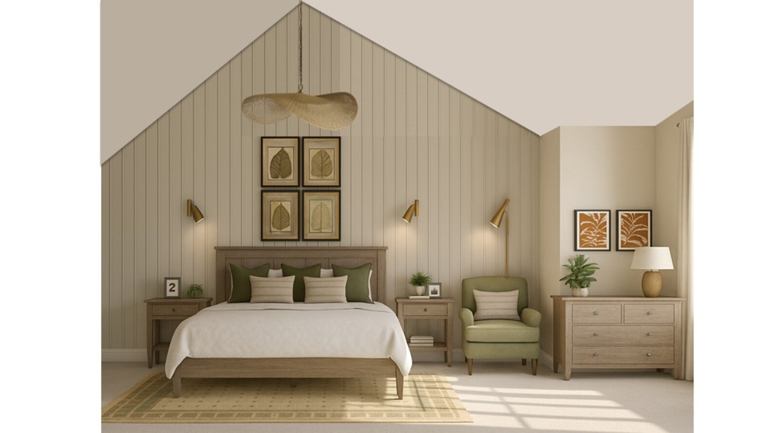 Artwork featuring leaf motifs in earthy tones hangs above the bed, harmonizing with the overall aesthetic and enhancing the sense of nature within the space.