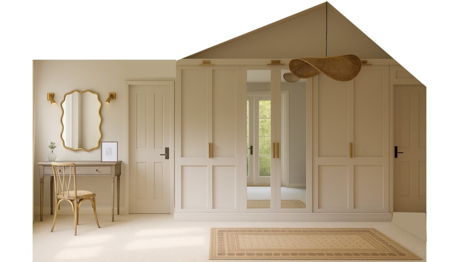 The focal point is a stylish bed adorned with a plush white duvet and multiple decorative cushions in muted greens and stripes, set against a beautifully paneled accent wall that adds visual interest.