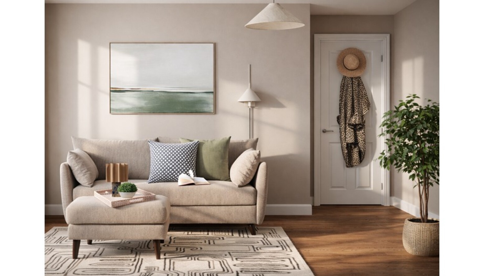 A stylish Model 08 sofa bed in a soft pumice hue offers flexibility for seating and sleeping arrangements. Cushions in green khaki and patterned designs enhance the sofa's cozy appeal. Positioned above the sofa, a 'Misty Fields' abstract canvas painting introduces subtle colors that echo the natural tones of the room.