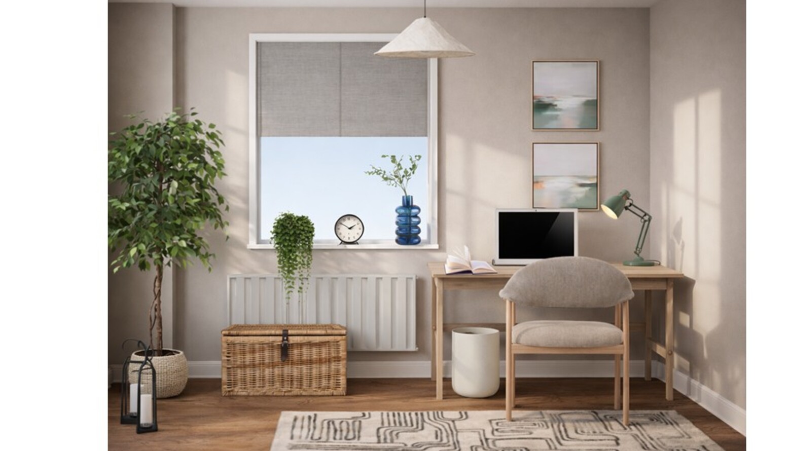 This dual-function bedroom and home office seamlessly blends comfort and productivity. The neutral walls create a calming backdrop, accentuated by wooden flooring that adds warmth to the space.