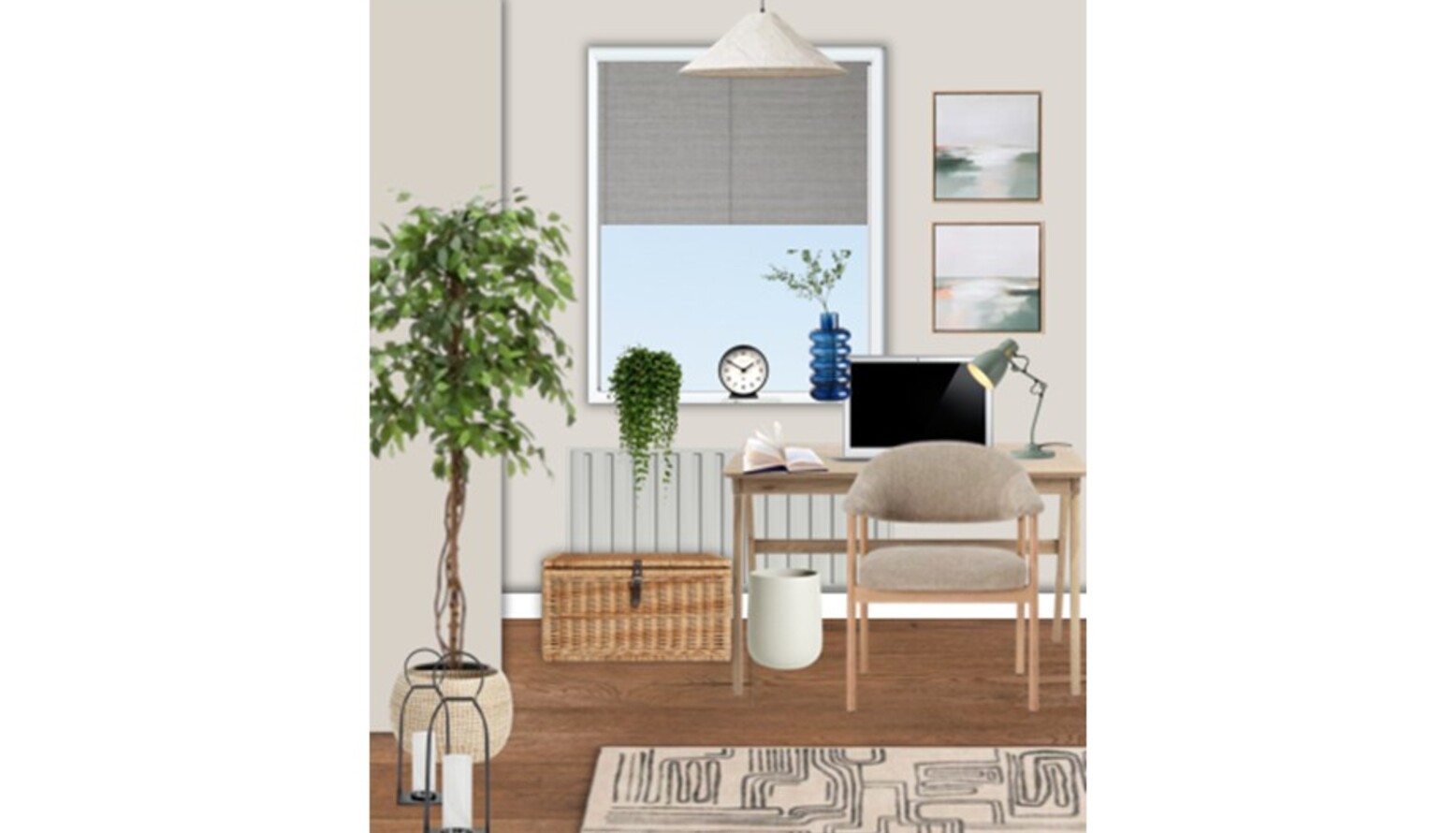 In one corner, an artificial Ficus tree in a black pot introduces a touch of greenery, contributing to a vibrant indoor environment. The inclusion of a wall memo board keeps essentials organized while adding functionality. A Julia table serves as a perfect workspace, paired with the elegance of a John Lewis Elk dining chair in oak/natural, providing comfort during work hours.