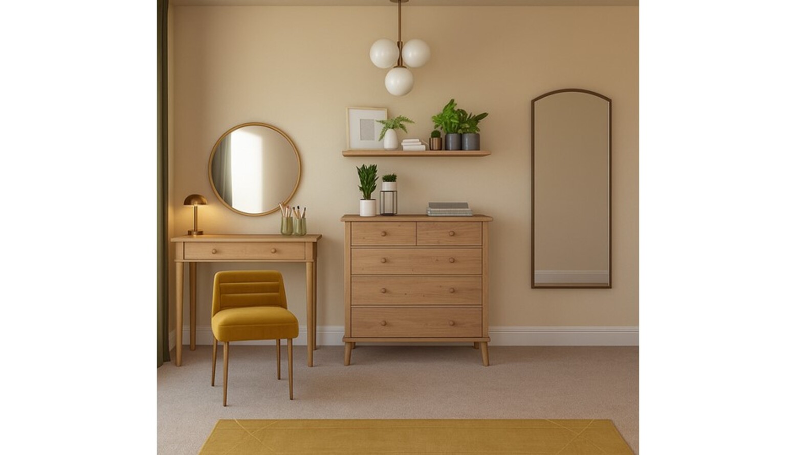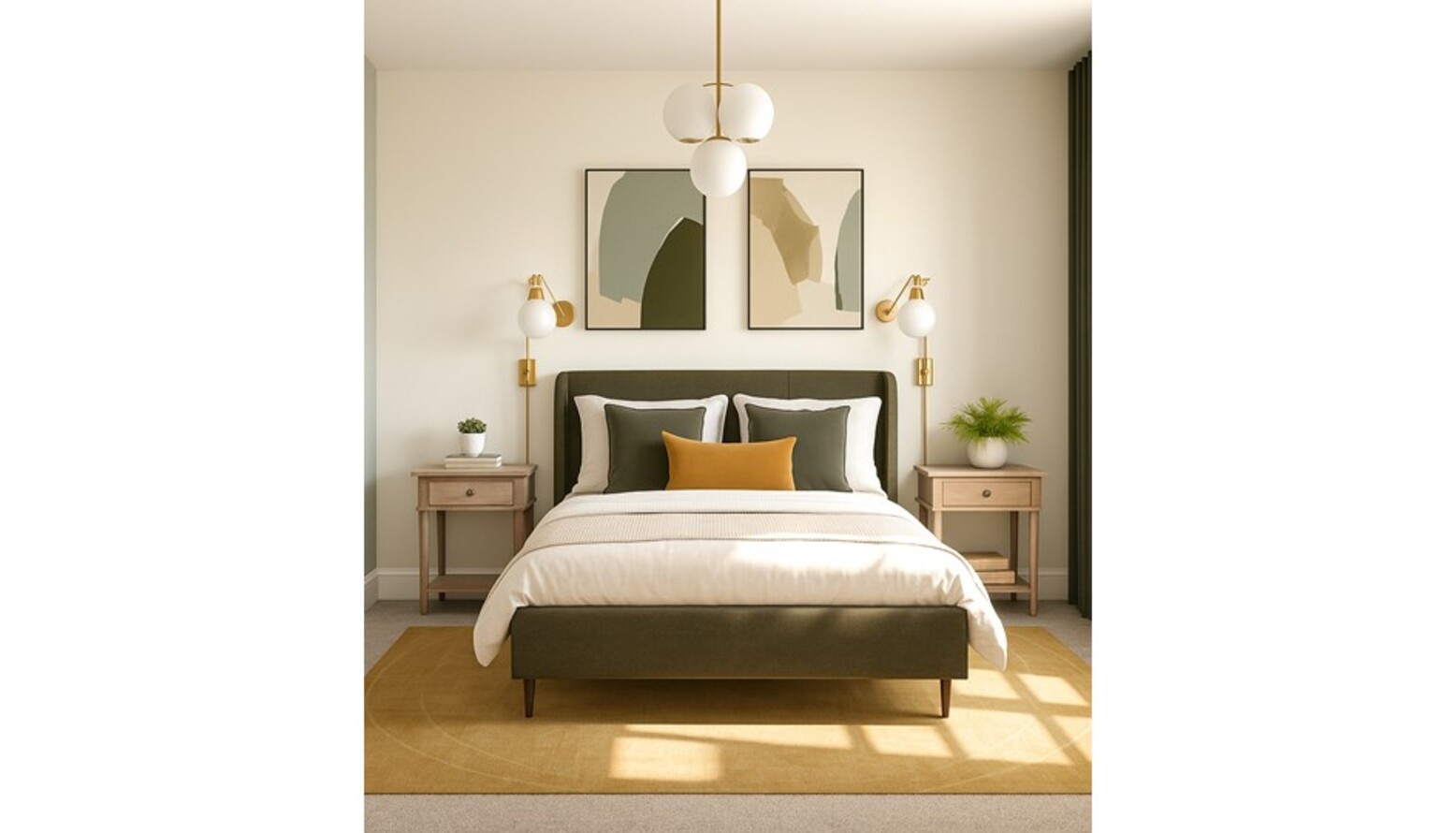 The master bedroom embodies a harmonious blend of comfort and style. The focal point of the room is a king-size ottoman storage bed, upholstered in natural fabric and olive green velvet, exuding luxe comfort and practicality. Flanking the bed are elegant bedside tables, each adorned with coordinating wall-mounted lamps that provide both functionality and ambient lighting. A striking combination of cushions in rich khaki and a vibrant amber adds a pop of color to the crisp white bedding, enhancing the overall aesthetic. Above the bed, two abstract artworks create a sophisticated backdrop, thoughtfully selected to complement the earthy tones throughout. An inviting gold flatwoven rug underfoot carries the warmth of the color palette, grounding the design with a soft texture. Storage is maximized with a stylish five-drawer chest and a chic dressing table featuring a drawer, both echoing the room's elegant theme. Natural elements are introduced with a small potted plant on one side table, adding freshness and vibrancy to the space. An oversized round mirror in antique gold enhances the room's depth while reflecting natural light, further brightening the atmosphere. In terms of lighting, a pendulum lamp and a table lamp in warm brass provide both illumination and a vintage touch. Floating shelves display personal treasures and add dimension to the walls. The room also has a modern touch with a complimentary mattress protector, ensuring comfort and hygiene. Each element, from the sophisticated furniture to the curated art, unites to create a serene and inviting master retreat.