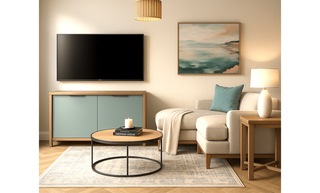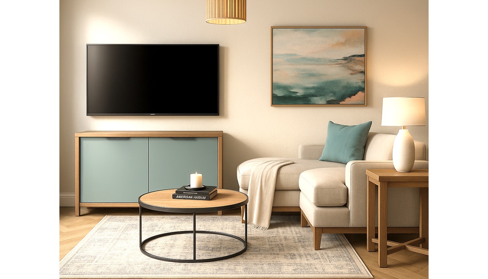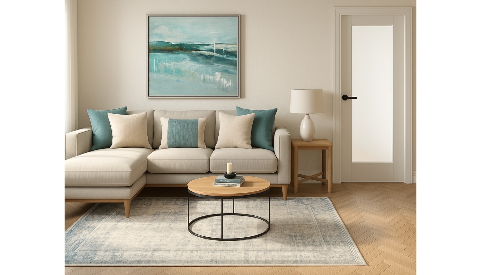 An elegant area rug, woven from fine materials, anchors the seating arrangement while radiating a harmonious blend of colors. The backdrop showcases a large framed canvas depicting serene oceanic views, further amplifying the coastal vibe.