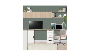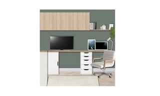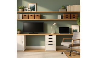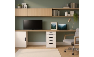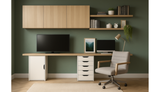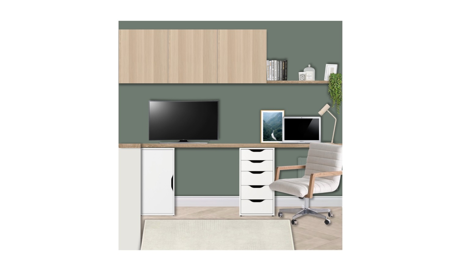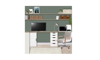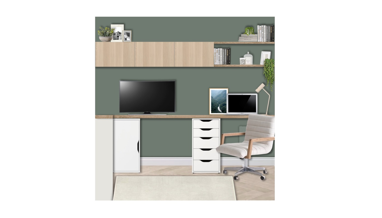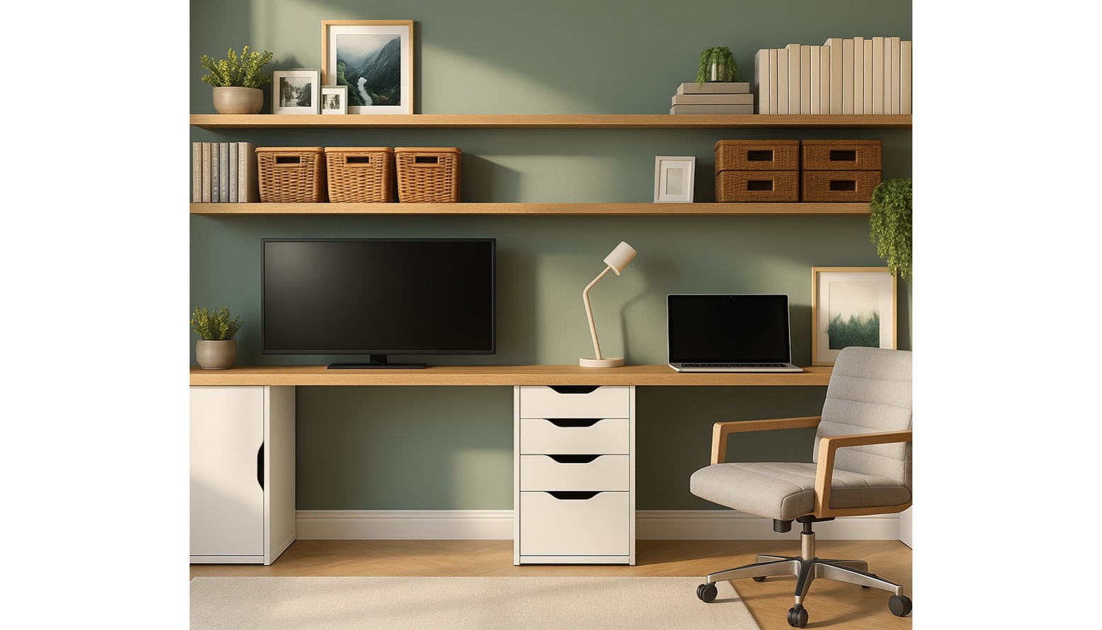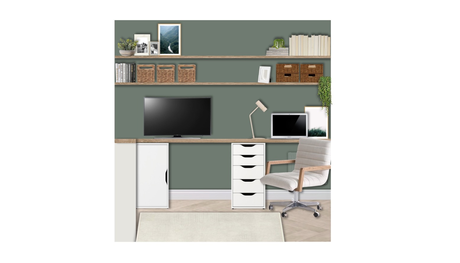 This home office is designed as a cosy and functional workspace, carefully curated to balance style and practicality. Soft, muted walls in a calming green shade set the backdrop for a serene atmosphere, complemented by warm wood tones. A long, sleek desk spans the room, featuring a natural wood surface paired with an organized white cabinet. Seating includes a modern ergonomic chair in light grey with wooden accents, providing comfort during long working hours. The wall-mounted shelving above is practical and stylish, displaying books, decorative items, and a small artificial plant which adds a touch of greenery. Lighting is carefully considered with a chic desk lamp that combines function and contemporary design. A flatwoven rug in camel and ivory underfoot adds texture while delineating the space. Decorative elements like a ceramic table lamp and framed artwork introduce personality and warmth, making this office feel inviting and snug.