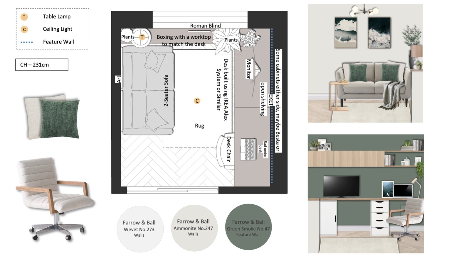 Paint: I have included some great paint colour suggestions for your room design with handy links so you can order any samples you want and then your chosen paint directly from the retailer when you are ready. It’s always best to use the retailer's paint calculator, or your decorator's estimate for paint quantity.
