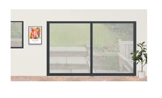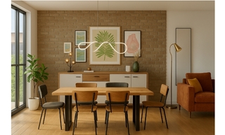 The open plan living, dining, and kitchen area boasts a harmonious blend of functionality and style. The room features a warm wooden floor that enhances the natural light flowing in through the large windows. A backdrop of textured beige brick walls adds depth and character to the space, giving a cozy, rustic feel.
