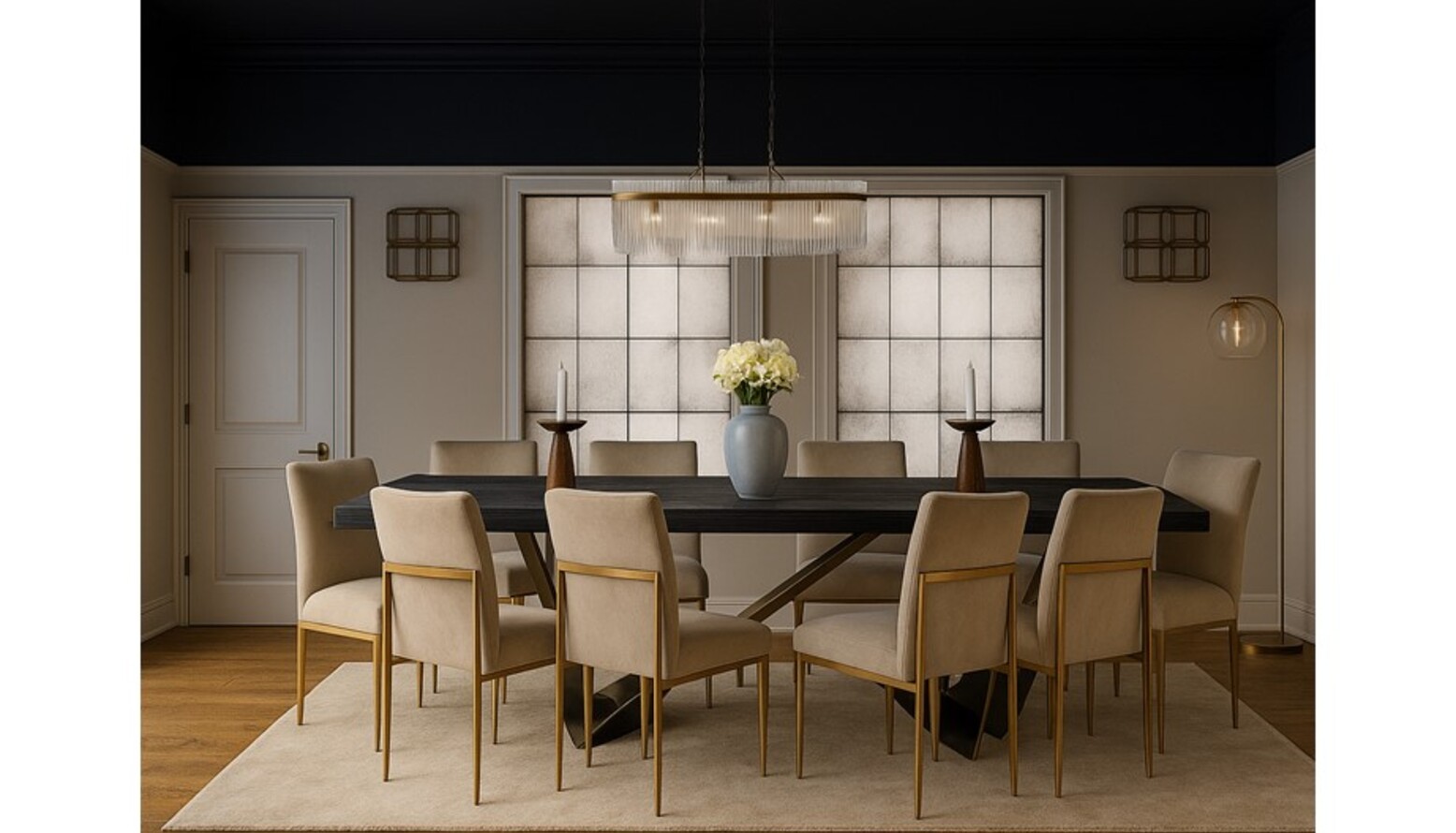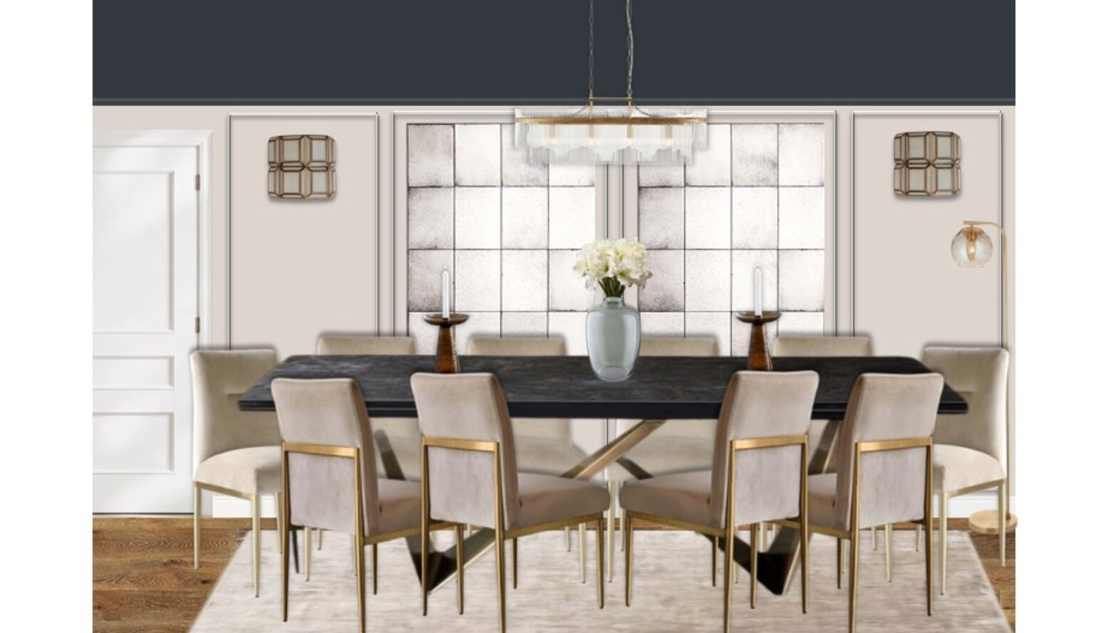 The dining room features a striking dark grey extending dining table capable of accommodating 8 to 10 guests, seamlessly paired with elegant champagne velvet dining chairs. A luxurious ambiance is enhanced by the Marietta pendant light in antique brass, providing warm illumination above the table. The space is anchored by a large taupe rug, adding comfort underfoot and a touch of softness.