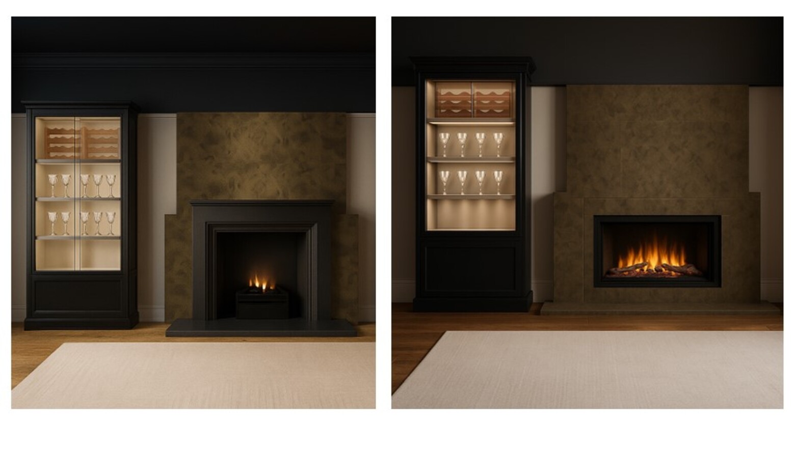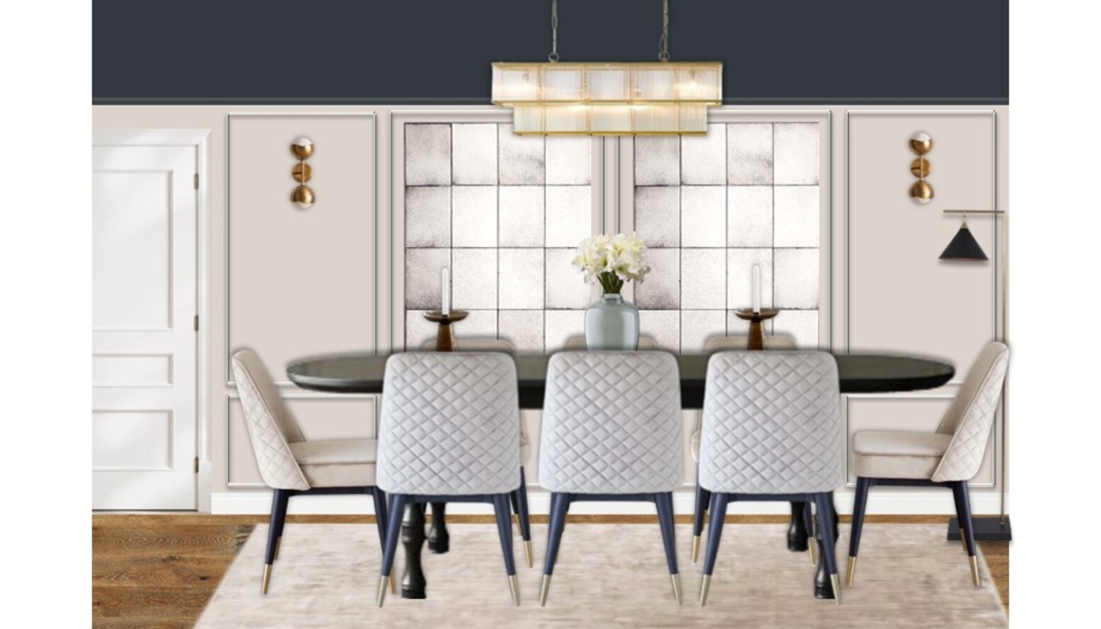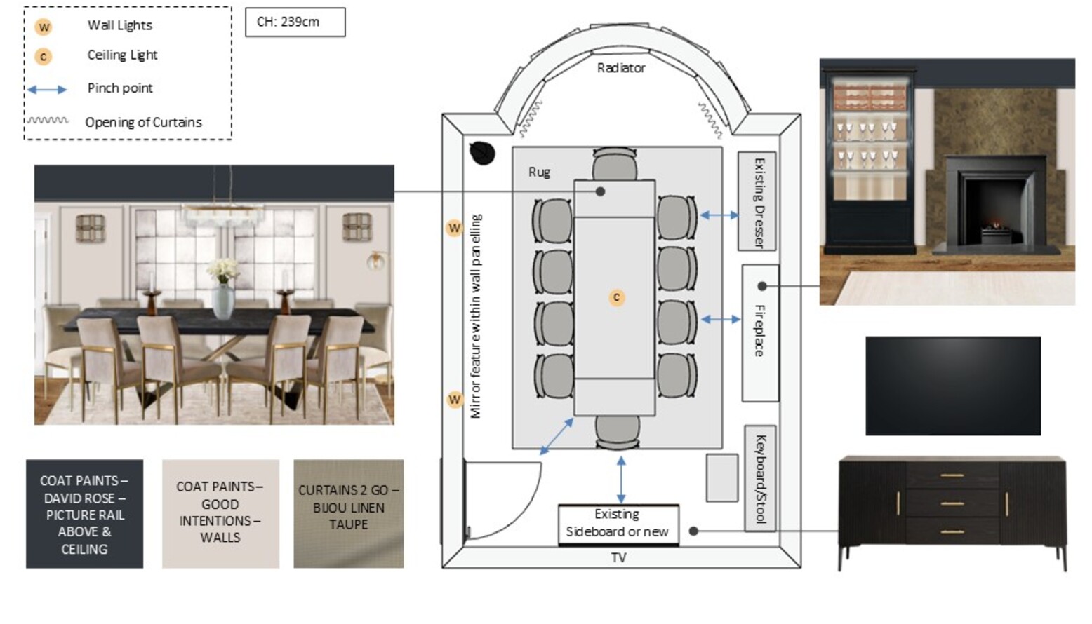 Additional furniture includes a stylish sideboard for storage and a walnut wood wine rack, ensuring both functionality and aesthetic appeal. The designer has provided a curated selection of paint colors and wall samples to aid in finalizing the room's look, emphasizing the importance of personalized details throughout.