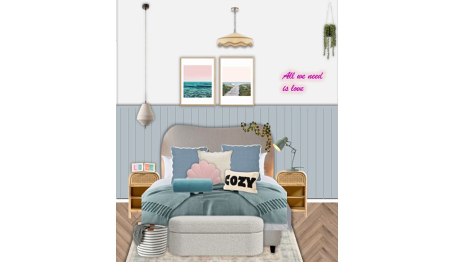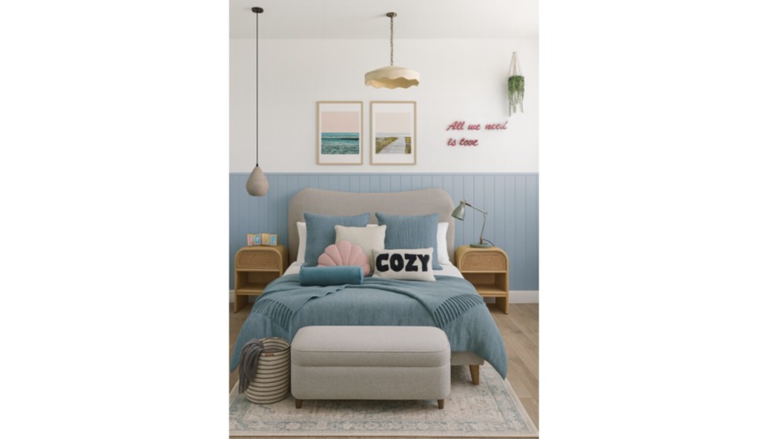 This cozy bedroom exudes warmth and comfort with its inviting color palette and thoughtfully selected furnishings. The focal point is the luxurious ivory boucle double ottoman storage bed, adorned with an array of textured cushions in shades of blue and blush, including a charming shell-shaped cushion and a prominently featured 'COZY' pillow. Flanking the bed, rattan bedside tables hold soft lighting and decorative items that enhance the room's relaxed vibe. A functional desk lamp adds a hint of sophistication. Visitor-friendly, the room is complemented by a patterned area rug beneath, providing tactile warmth underfoot. The walls are elegantly finished with lower paneling painted in a tranquil blue, contrasting beautifully with the light upper wall. Ceiling lights have delicate shapes that mimic the sense of calm. The addition of beautiful artwork topped with an inspirational neon sign adds a personal touch while creating an engaging focal point. Functional decor features include storage baskets and a stylish laundry basket, ensuring neatness while maintaining a sense of style. Artificial plants are also present, bringing a hint of nature indoors.