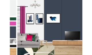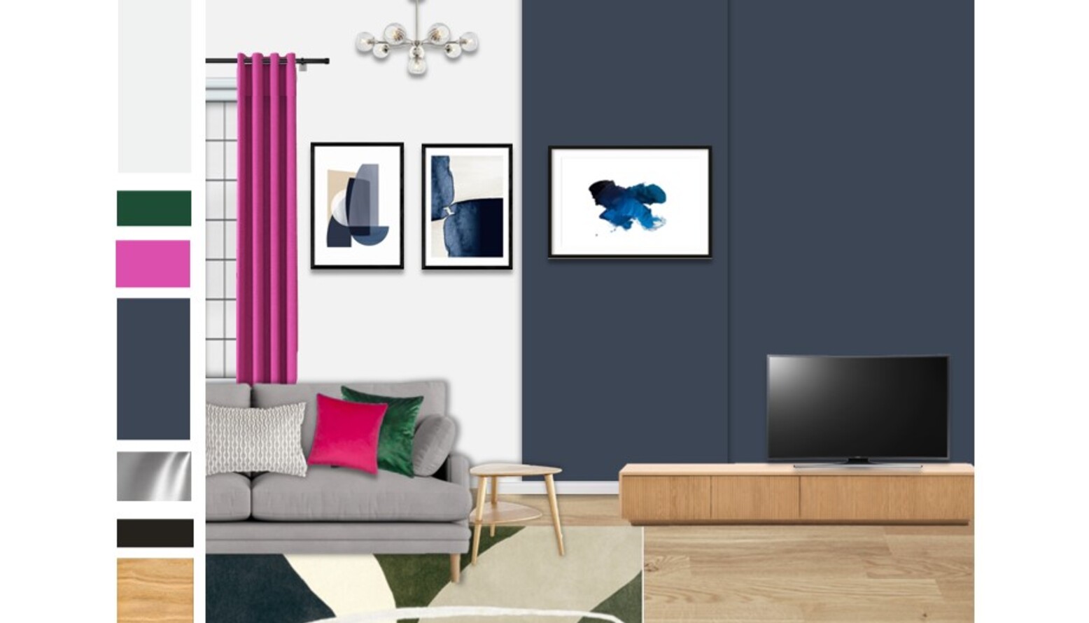 Flanking the sofa, striking artwork hangs on the dark navy wall, featuring abstract designs that enhance the overall aesthetic. The natural light streaming through the windows is softened by rich fuchsia curtains, creating a warm and inviting atmosphere.