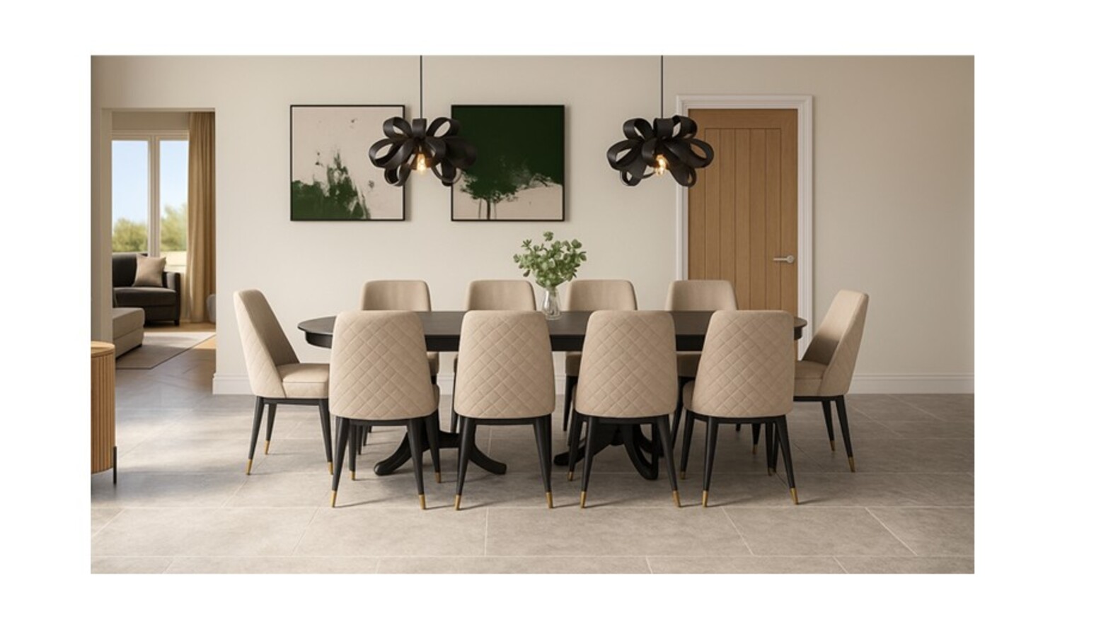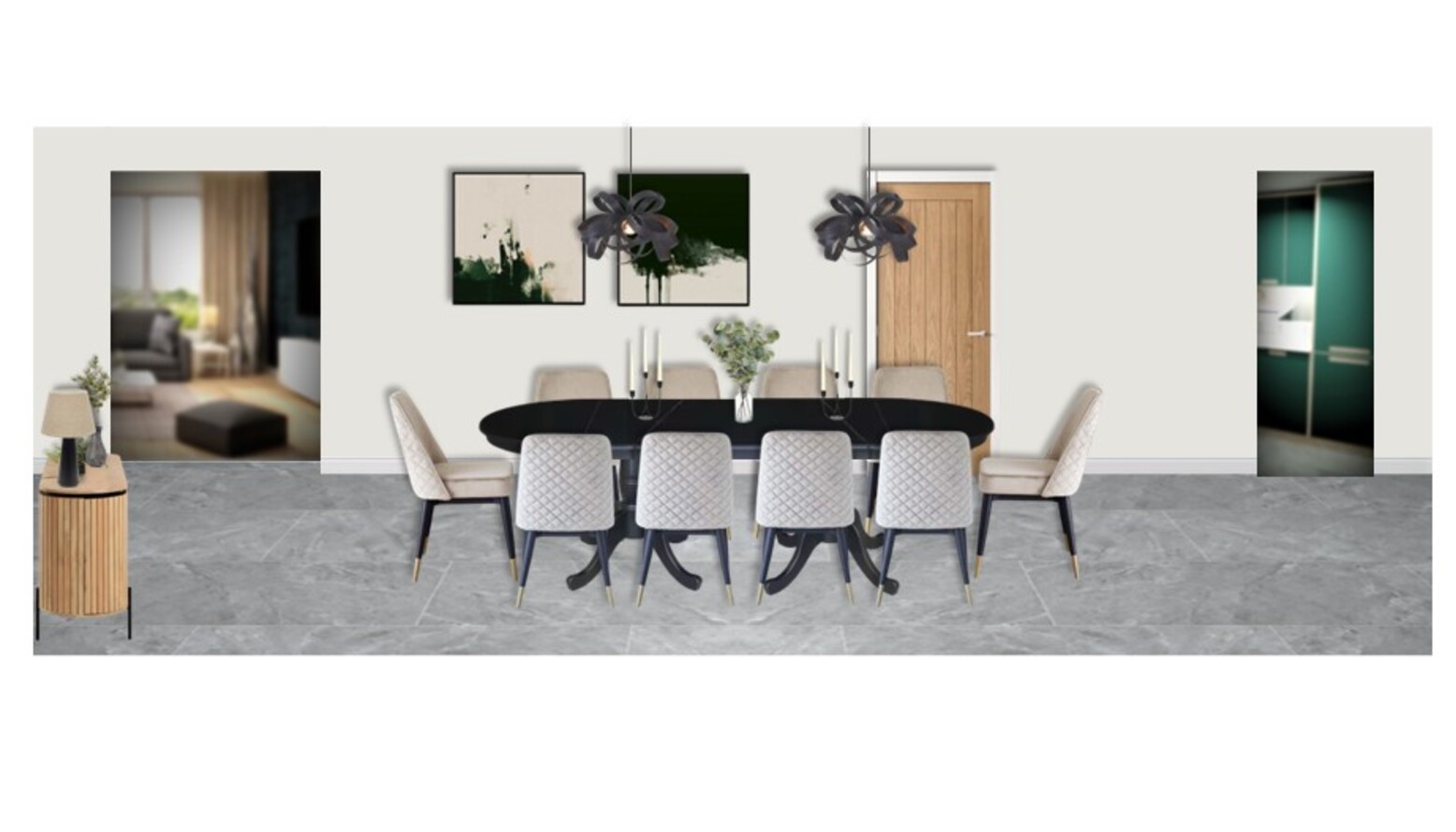 A modern large black dining table forms the centerpiece, surrounded by a set of two stylish champagne velvet dining chairs and additional stackable dark green velvet dining chairs, ensuring both elegance and flexibility.