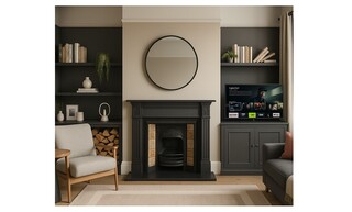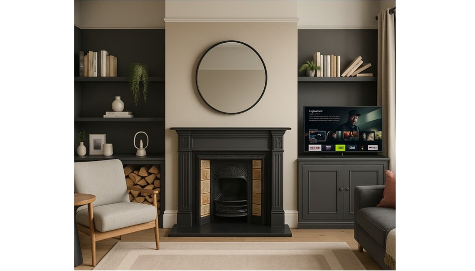 Flanking the fireplace are stylish shelving units, painted in a deep charcoal hue. These shelves are filled with an assortment of books and decorative objects, adding character and personality to the design.