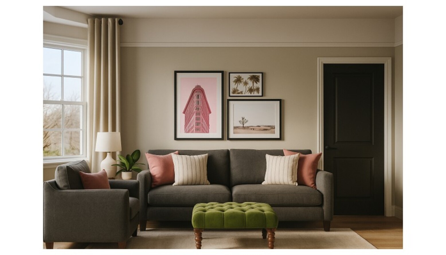 Comfort is prioritized with a mix of thoughtfully selected furniture. A light grey accent chair with a wooden frame provides a relaxing spot, while a rich, dark sofa invites you to sink in with its removable cover for easy maintenance. A textured rug in soft tones anchors the space, providing warmth underfoot.