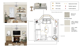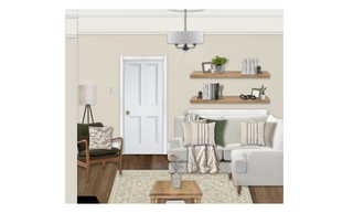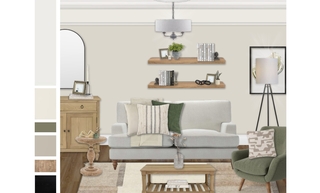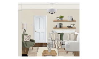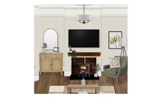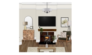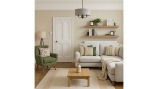 This living room features a harmonious blend of comfort and contemporary style. A spacious corner sofa is upholstered in a neutral textured fabric, accompanied by a two-seater sofa that complements the overall look. The flooring is adorned with a large ivory and copper flatwoven rug, adding warmth underfoot. A mellow oak coffee table sits in front, providing a perfect spot for accessories or books. For seating options, an accent chair in a rich green linen adds a pop of color. Above the radiator, floating shelves in natural wood display an array of decorative items and plants, enhancing the room's inviting atmosphere. Lighting is provided by a stylish three-arm ceiling light that offers a soft glow, while a tripod floor lamp in black adds a modern touch. An intricately designed arch mirror on the wall reflects light and creates an illusion of space. Cushions in various textures and patterns are strategically placed to enhance comfort. Artificial olive trees in ceramic vases bring a touch of greenery, and decorative ceramic bud vases add artistic flair. Finally, simple but elegant wall-mounted shelving allows for the display of personal touches and books, integrating functionality with aesthetic appeal.