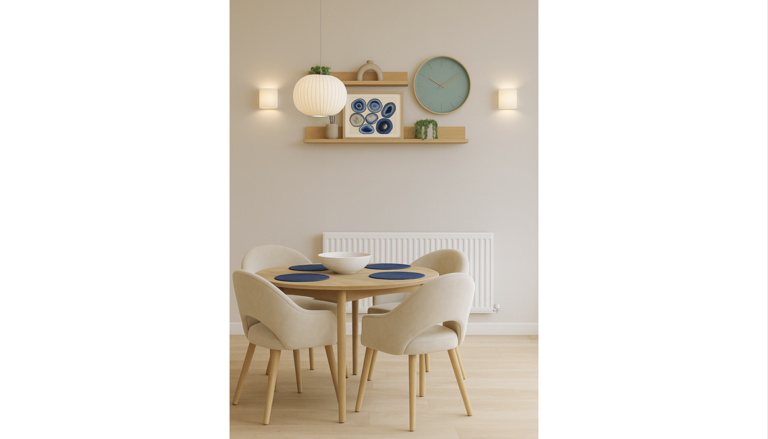 A floating wooden shelf adds visual interest to the wall, displaying a curated selection of decorative items, including an artfully arranged piece framed in natural oak that features shades of blue. A round wall clock in a calming turquoise hue complements the overall color scheme, while a stylish wall clock adds a subtle touch of charm.