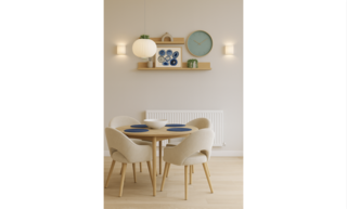 The kitchen and dining area showcases a clean and inviting ambiance with soft, neutral tones adorning the walls. A round wooden dining table takes center stage, complemented by plush, cream-colored chairs featuring a subtle curvature for comfort. The table is elegantly set with navy blue placemats, topped by a sleek white bowl that adds a touch of sophistication.