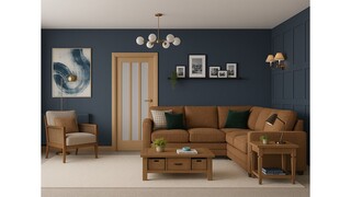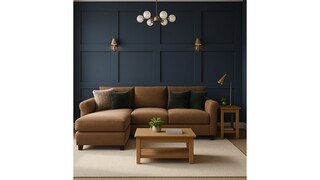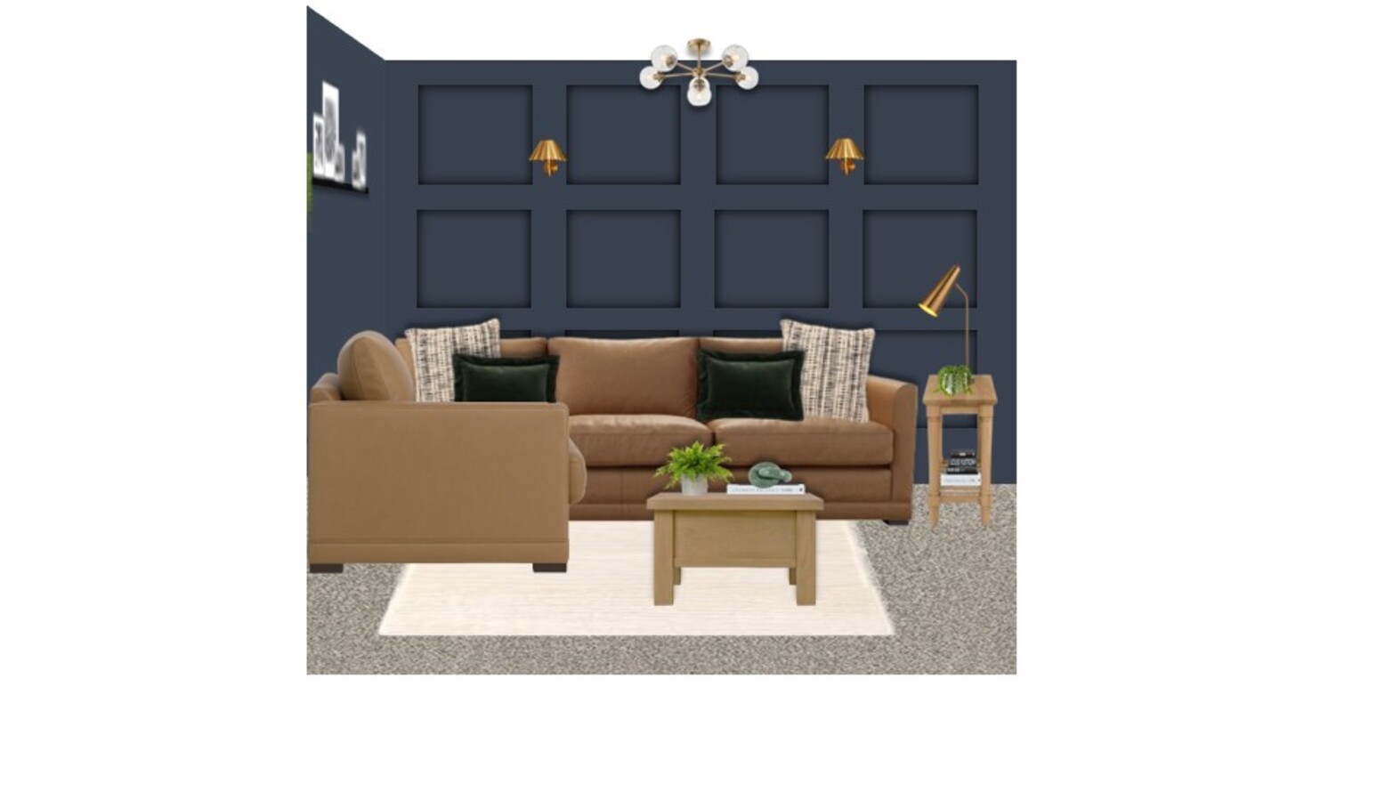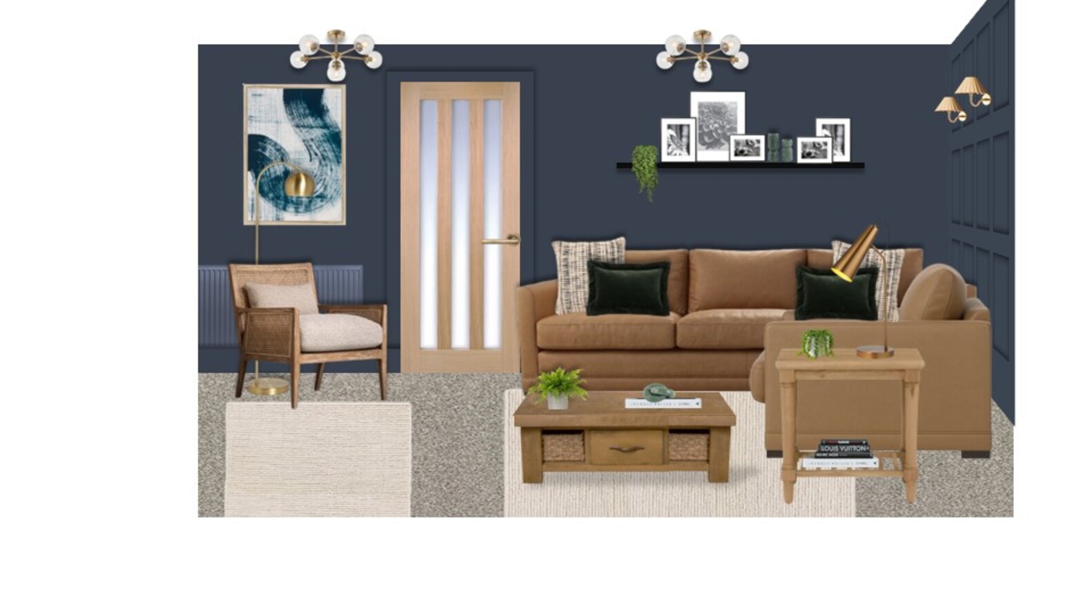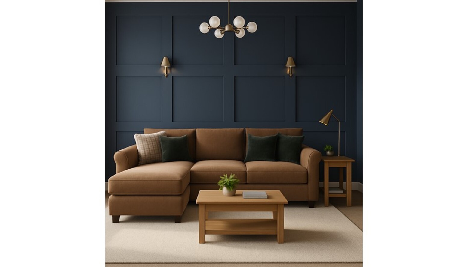 This inviting living room features a medium corner sofa upholstered in saddle antique leather, providing a warm and comfortable seating area. The rich brown tones of the sofa are beautifully complemented by dark green cushions, which add a touch of color and comfort. The room is anchored by a light cream rug that softens the space and creates a cozy atmosphere underfoot. A simple wooden coffee table sits in front of the sofa, providing a functional yet stylish surface for drinks and decor. The walls are painted in a deep blue, enhanced with geometric paneling that adds depth and visual interest. This bold backdrop is accented by antique brass lighting fixtures, including a modern chandelier above and wall sconces flanking the sofa. These lighting elements provide both illumination and a touch of elegance. On one side of the room, a sleek sideboard in a natural finish offers additional storage and display space. It harmonizes with the mellow oak sofa table beside the armchair, providing a cohesive look throughout the room. Complementary decor items include potted plants that bring life and freshness to the space. Artwork, such as framed prints, is hung on the walls, and a large round mirror in antique gold reflects the room’s beauty and enhances the sense of space and light. Overall, the design successfully marries modern and classic elements, creating a comfortable and stylish living area perfect for relaxation and entertaining.