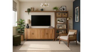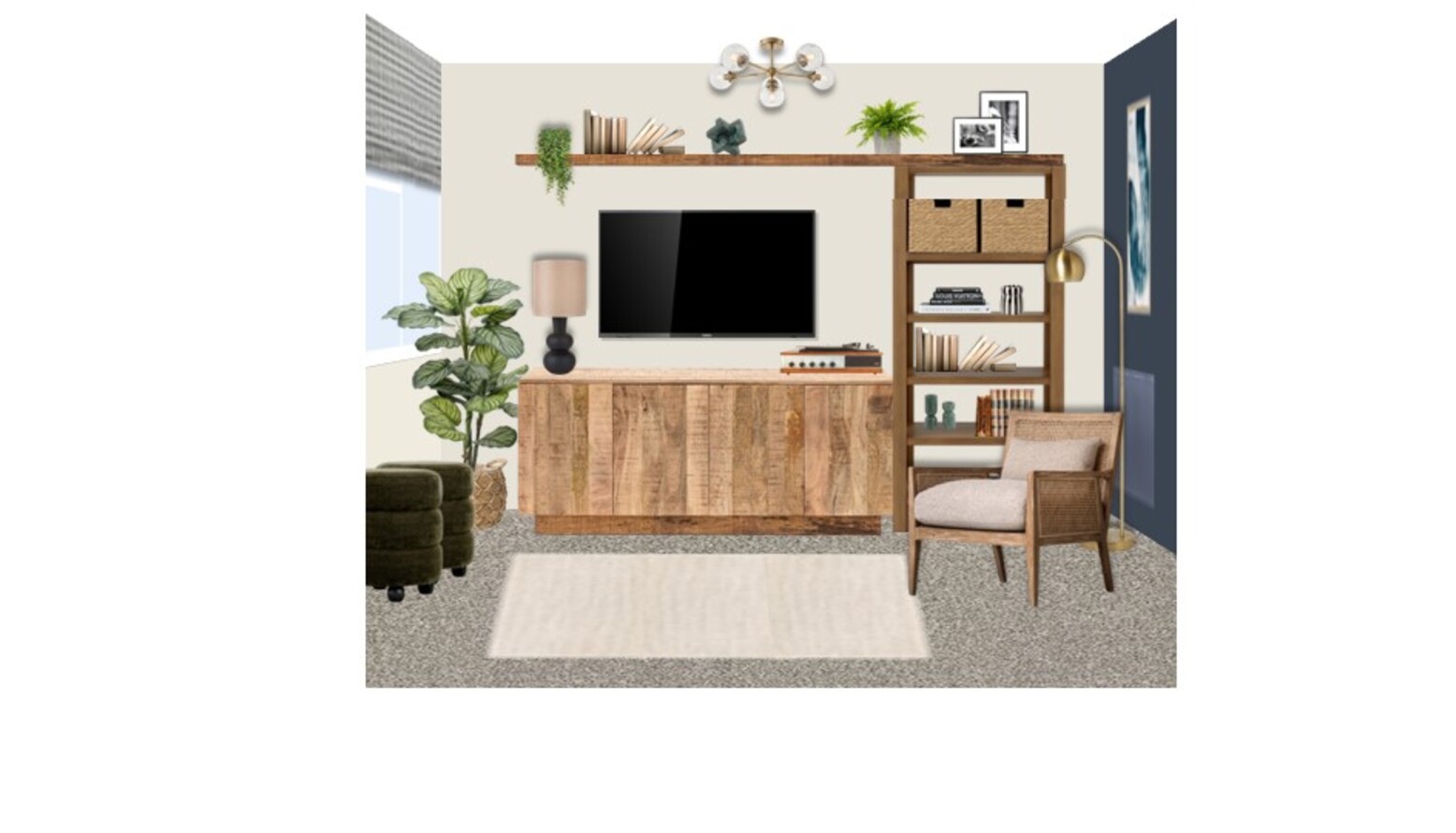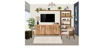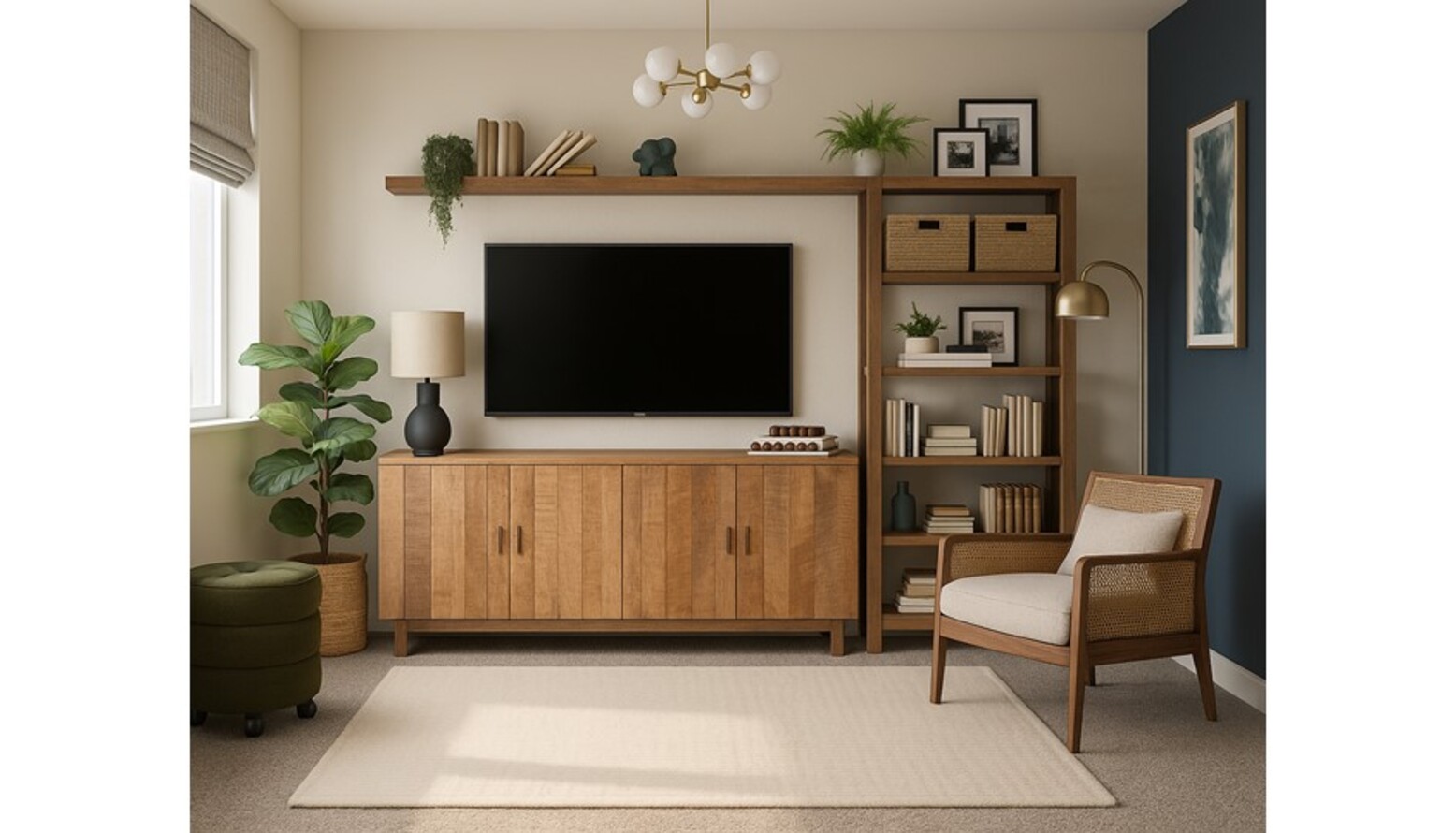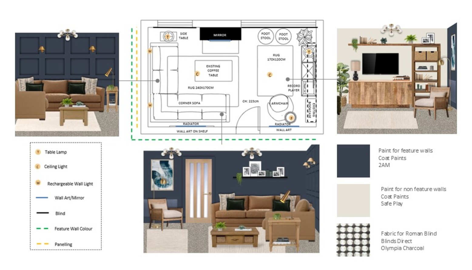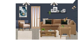 This inviting living room features a medium corner sofa upholstered in saddle antique leather, providing a warm and comfortable seating area. The rich brown tones of the sofa are beautifully complemented by dark green cushions, which add a touch of color and comfort. The room is anchored by a light cream rug that softens the space and creates a cozy atmosphere underfoot. A simple wooden coffee table sits in front of the sofa, providing a functional yet stylish surface for drinks and decor. The walls are painted in a deep blue, enhanced with geometric paneling that adds depth and visual interest. This bold backdrop is accented by antique brass lighting fixtures, including a modern chandelier above and wall sconces flanking the sofa. These lighting elements provide both illumination and a touch of elegance. On one side of the room, a sleek sideboard in a natural finish offers additional storage and display space. It harmonizes with the mellow oak sofa table beside the armchair, providing a cohesive look throughout the room. Complementary decor items include potted plants that bring life and freshness to the space. Artwork, such as framed prints, is hung on the walls, and a large round mirror in antique gold reflects the room’s beauty and enhances the sense of space and light. Overall, the design successfully marries modern and classic elements, creating a comfortable and stylish living area perfect for relaxation and entertaining.