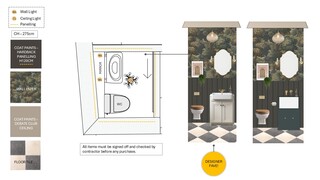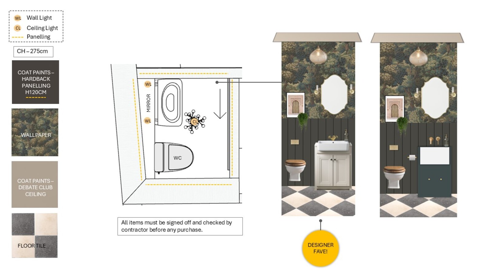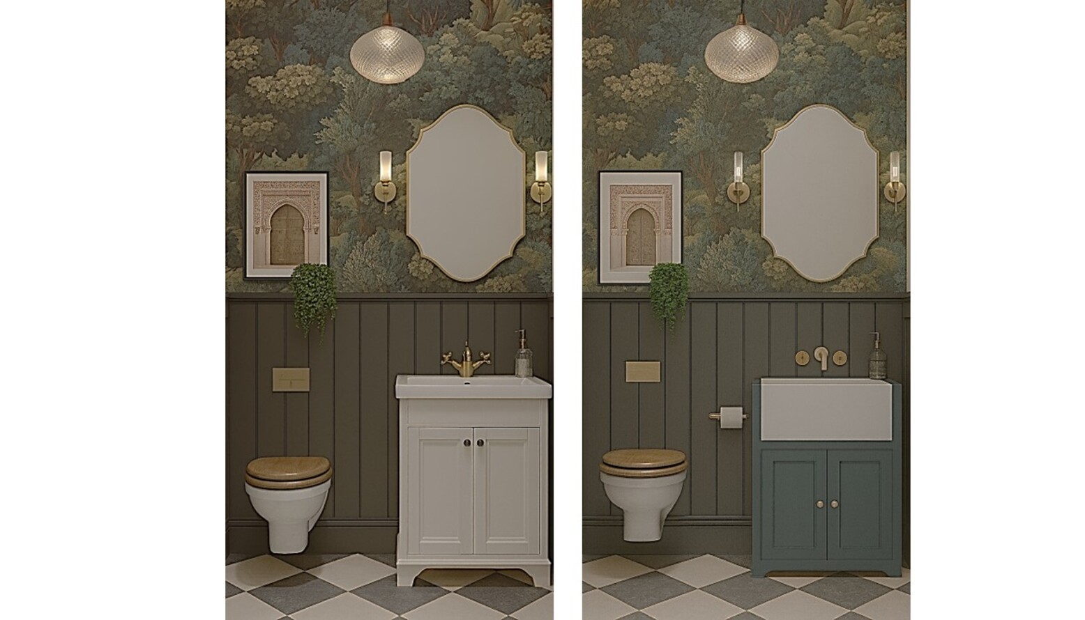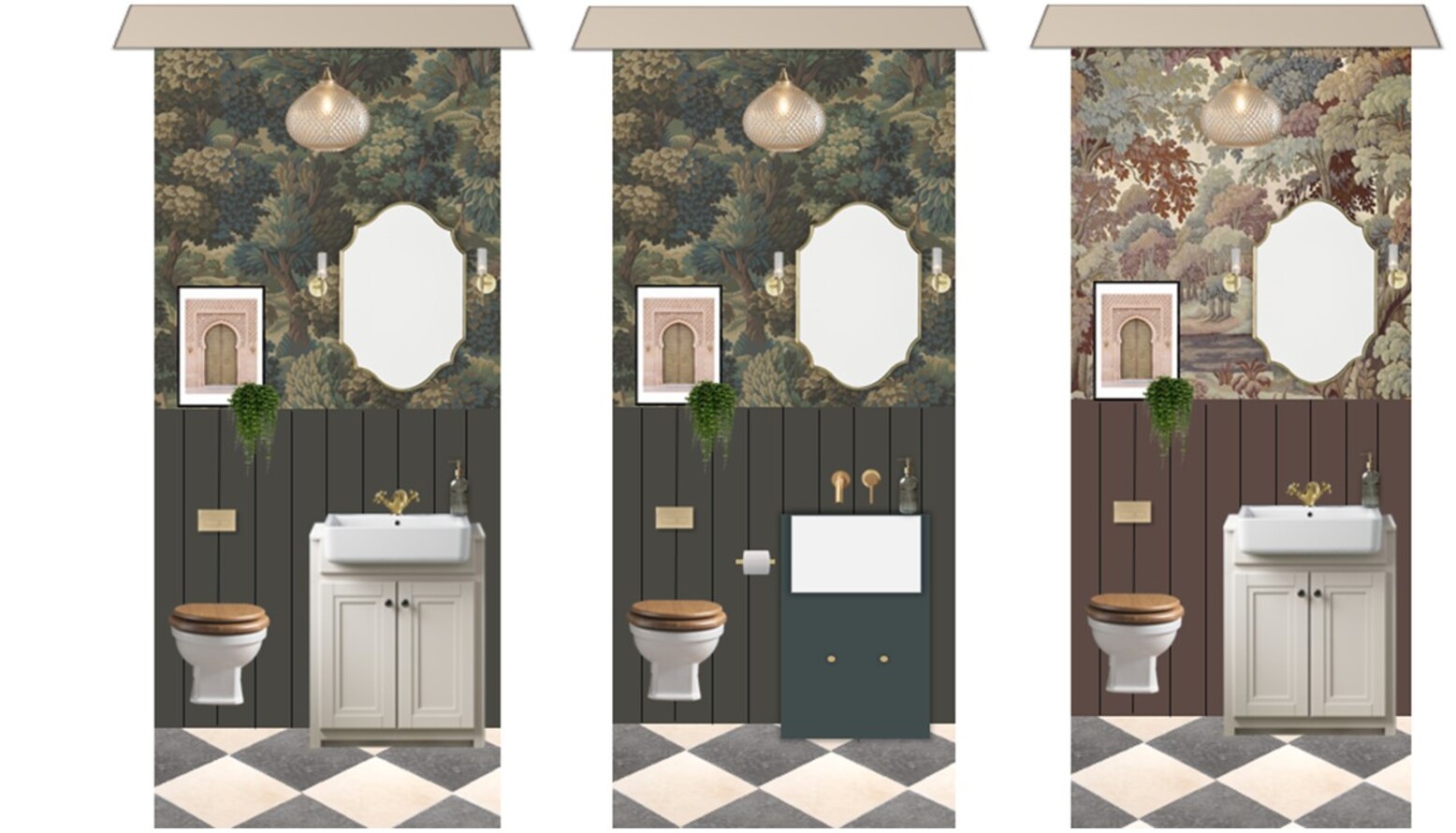 This charming cloakroom WC showcases a blend of elegance and functionality. The walls are adorned with a beautifully detailed mural depicting lush greenery, enhancing the inviting atmosphere of the space. The lower half features dark paneling that contrasts with the lighter elements above, creating a sophisticated balance. A wall-mounted vanity in a soft white finish complements the dark walls, providing essential storage and a charming basin for everyday use. Brushed brass fittings, including a wall-mounted basin mixer tap and accessories, introduce a touch of warmth and luxury. A captivating Heidi pendant light hangs above the vanity, casting a warm glow that highlights the mirror framed in gold, adding an elegant focal point. The bathroom is completed with classic elements like the Burlington wall-hung toilet, soft-closing walnut toilet seat, and practical accessories including a brushed brass toilet roll holder and smoked glass soap dispenser. The patterned floor tiles in soft monochrome hues subtly tie the entire design together, ensuring the space is both stylish and practical for various needs.