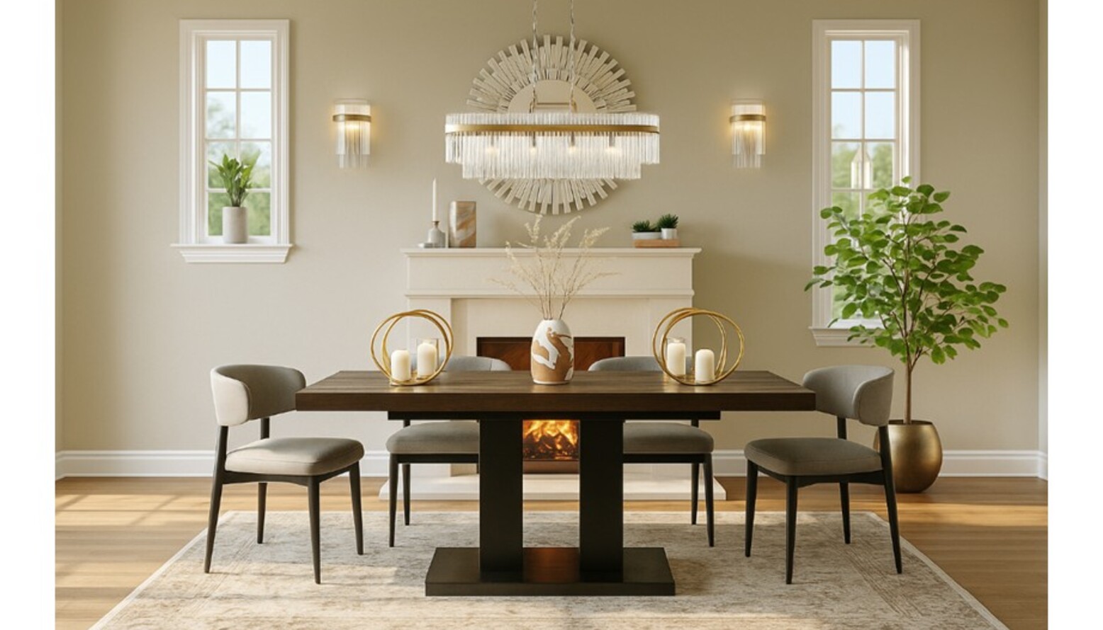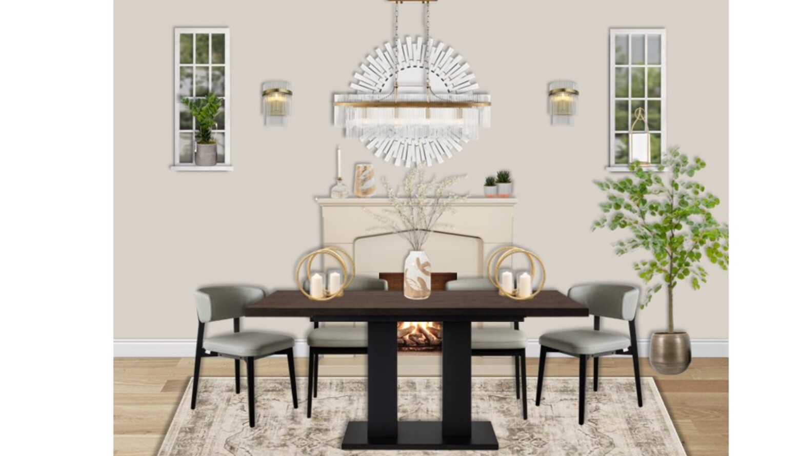 Decor elements include marbled hurricane candle holders, strategically placed on the dining table, enhancing the dining experience with their gentle glow. Real and faux plants are integrated into the design, with a faux pussy willow branch providing a natural touch.