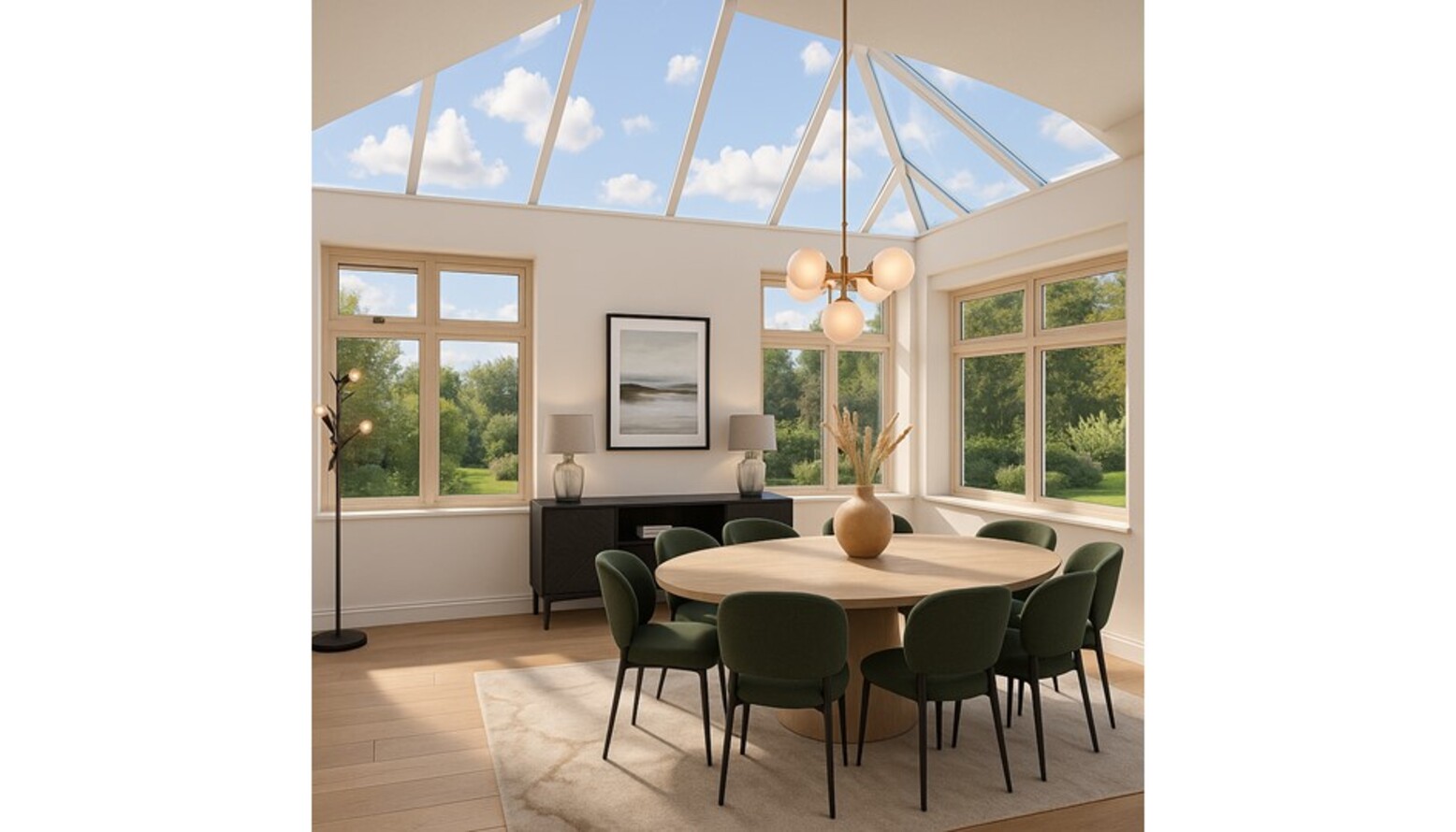 This dining room conservatory is beautifully bathed in natural light thanks to its expansive windows and skylight. The elegantly rounded dining table takes center stage, surrounded by plush green dining chairs that provide a touch of warmth and comfort. Above, a striking pendant light with multiple globes adds a contemporary flair, illuminating the space in a gentle glow.