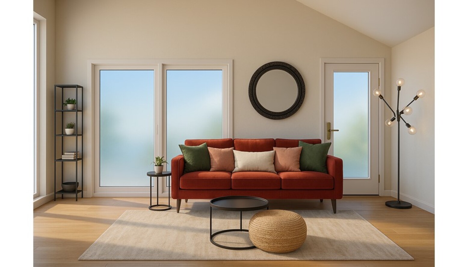 The walls are adorned with a tasteful piece of artwork, adding a layer of sophistication and tying in the color scheme seamlessly. A soft, patterned rug anchors the furniture, creating a cozy feel underfoot. The room is imbued with lush greenery from thoughtfully placed plants, enhancing the connection to nature that the conservatory design offers.