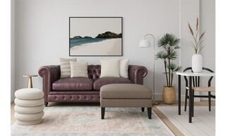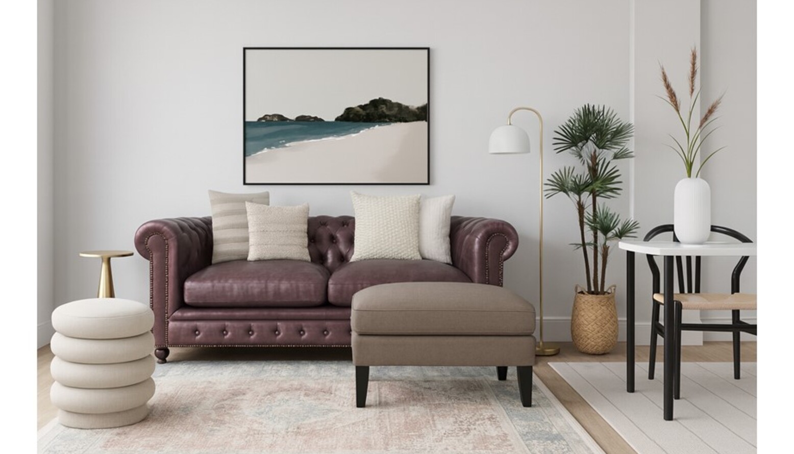 A striking Chesterfield sofa in a rich plum hue takes center stage, adorned with an assortment of beige and ivory cushions that add texture and comfort.