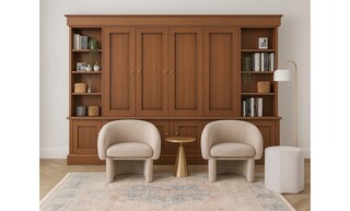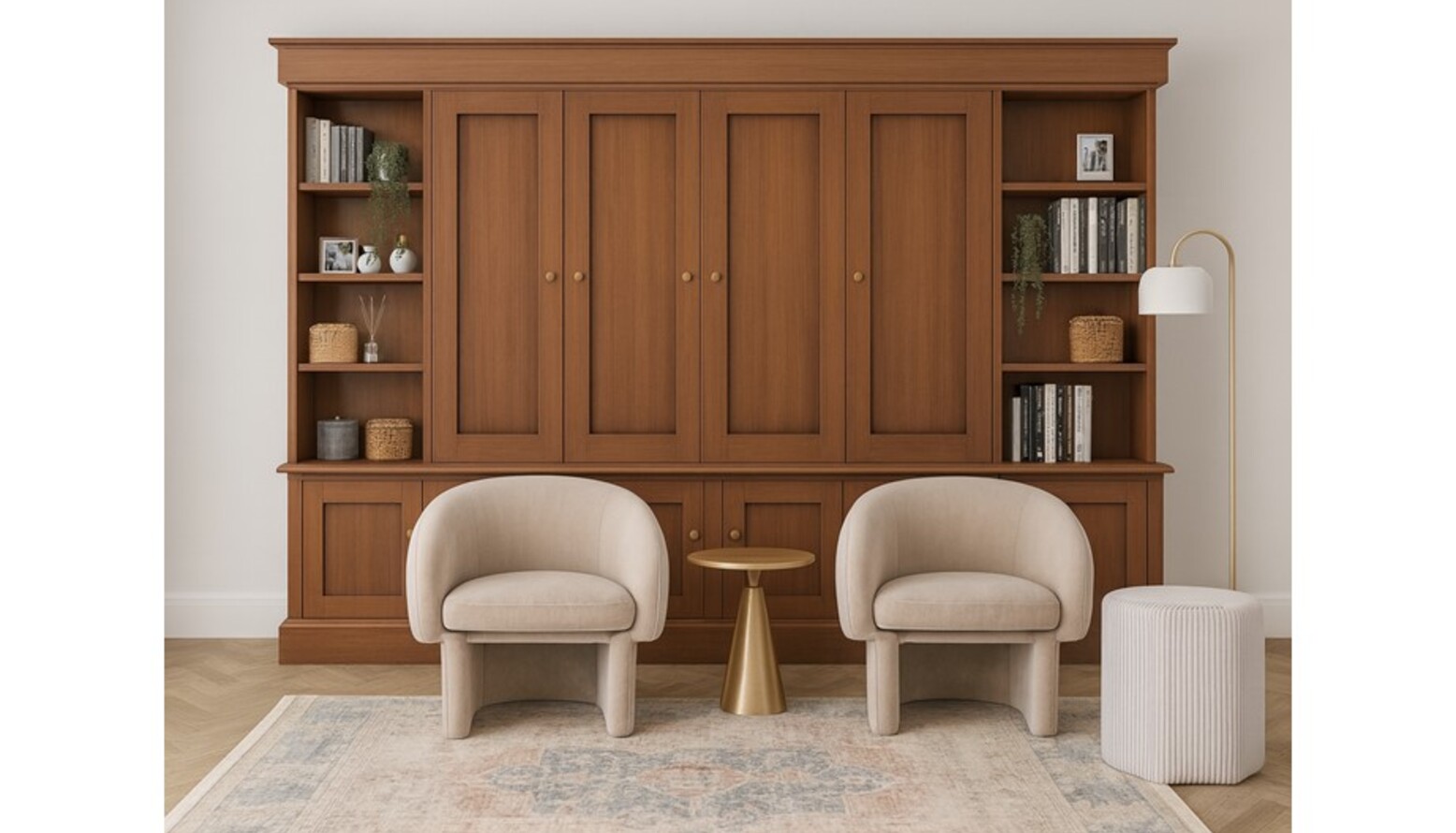 A neutral, layered rug with subtle patterns anchors the seating area, enhancing the room's warmth.