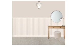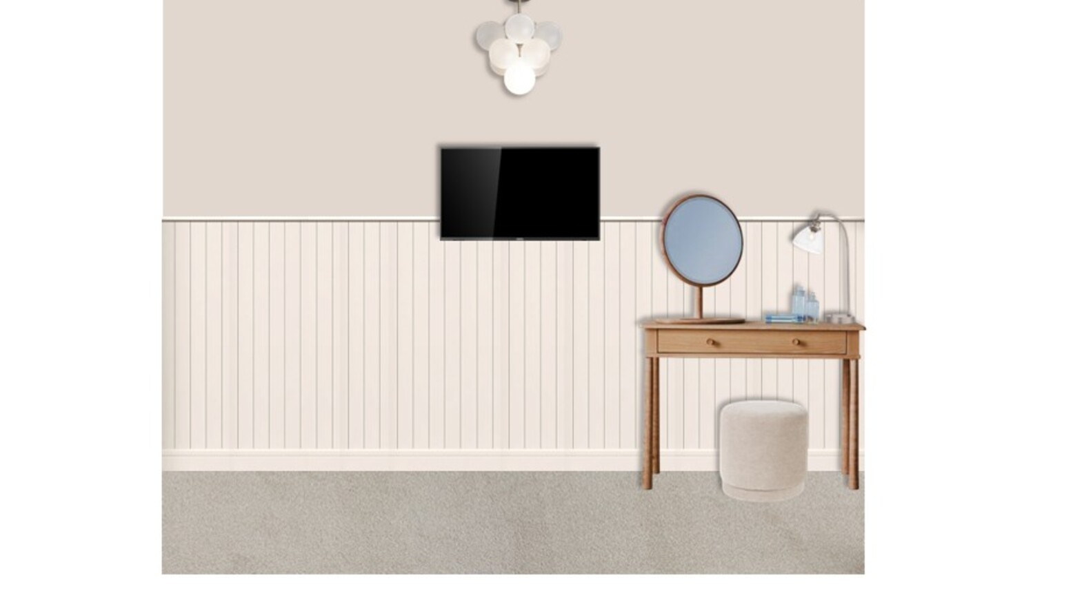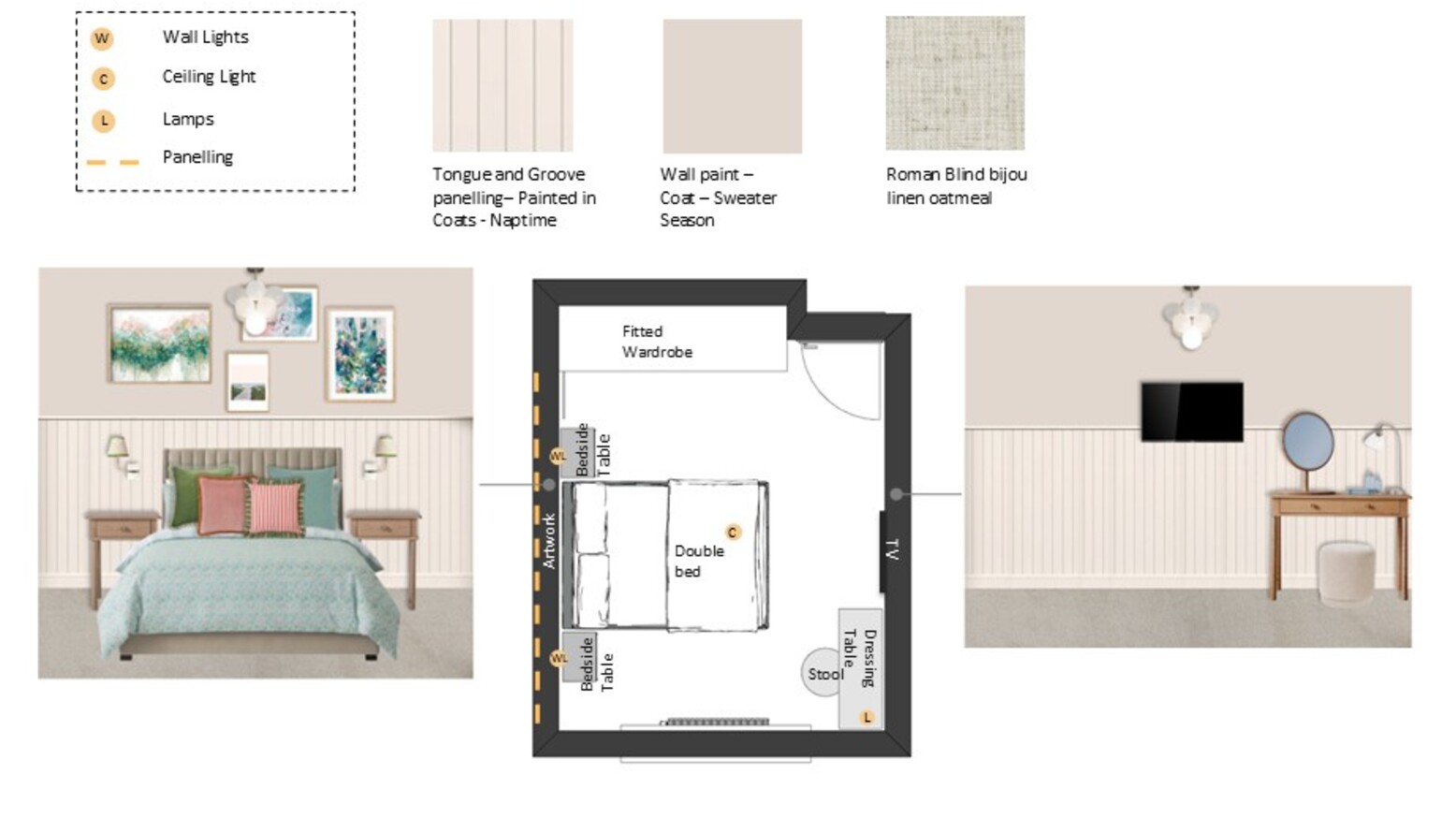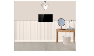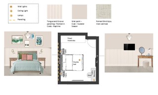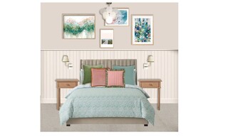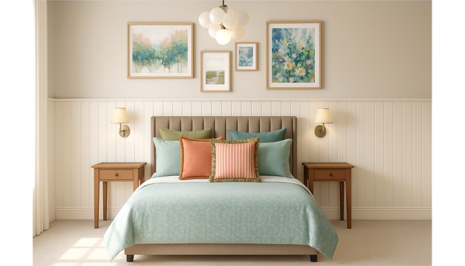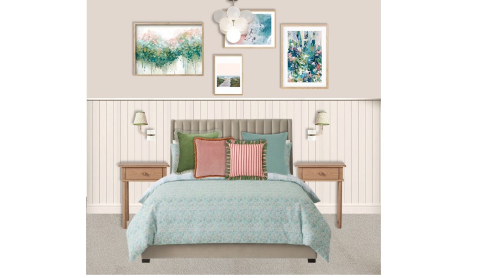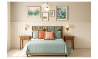 This inviting bedroom features a soothing color palette with a focus on serenity. The bed is dressed in a lovely powder blue duvet cover set, complemented by an array of textured cushions in various shades including pink, green, and a soft natural hue. The headboard is upholstered in a subtle neutral tone, adding to the calming atmosphere of the room. Flanking the bed are rich wooden bedside tables, each topped with stylish wall-mounted lamps that provide warm, ambient lighting. The gentle illumination enhances the cozy feel of the space. Above the bed, an artful gallery wall showcases framed artwork, blending natural colors in an array of designs, bringing an artistic flair to the room. A semi-flush matte silver ceiling light adds a contemporary touch while maintaining the room's elegant ambiance. The flooring is carpeted in a light tone, further enhancing the room's comfort and warmth. A chic pouffe in a taupe teddy fabric is placed at the foot of the bed, adding both style and functionality, perfect for a cozy accent or extra seating. Overall, the design skillfully combines comfort and style, creating a restful retreat perfect for relaxation.
