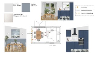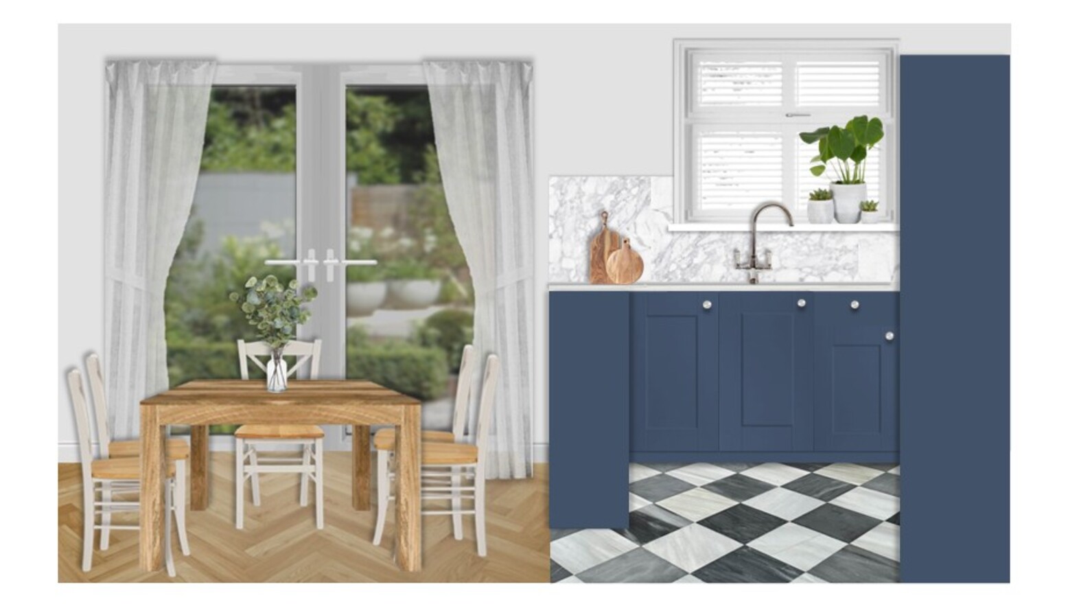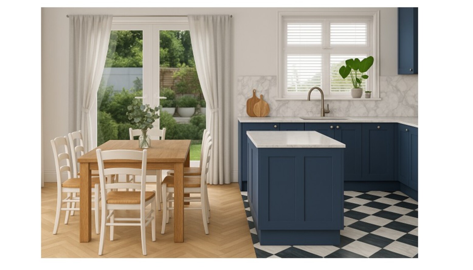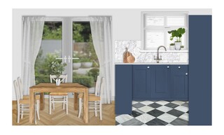 This kitchen and dining area combines functionality with stylish design. The focal point is the rich navy cabinetry that contrasts beautifully with the marble-effect countertops, adding a sophisticated touch to the space. Large windows allow natural light to fill the room, with sheer curtains that gently filter the sunlight, creating a warm and inviting atmosphere.