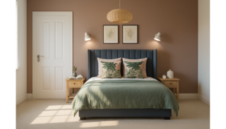 This inviting bedroom showcases a serene design, perfect for relaxation. The warm earth-toned walls create a cozy atmosphere, contrasting beautifully with the deep navy headboard of the bed.