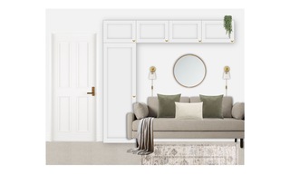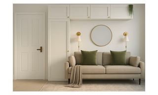 Above the sofa, stylish brass wall sconces flank a circular, minimalist wall mirror, adding warmth and light to the space.