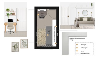 The walls are adorned with carefully selected art pieces that reflect personal taste, while the combination of shelving and wall-mounted furniture keeps the room organized. Greenery in the form of real or faux plants brings a refreshing touch of nature indoors.