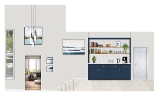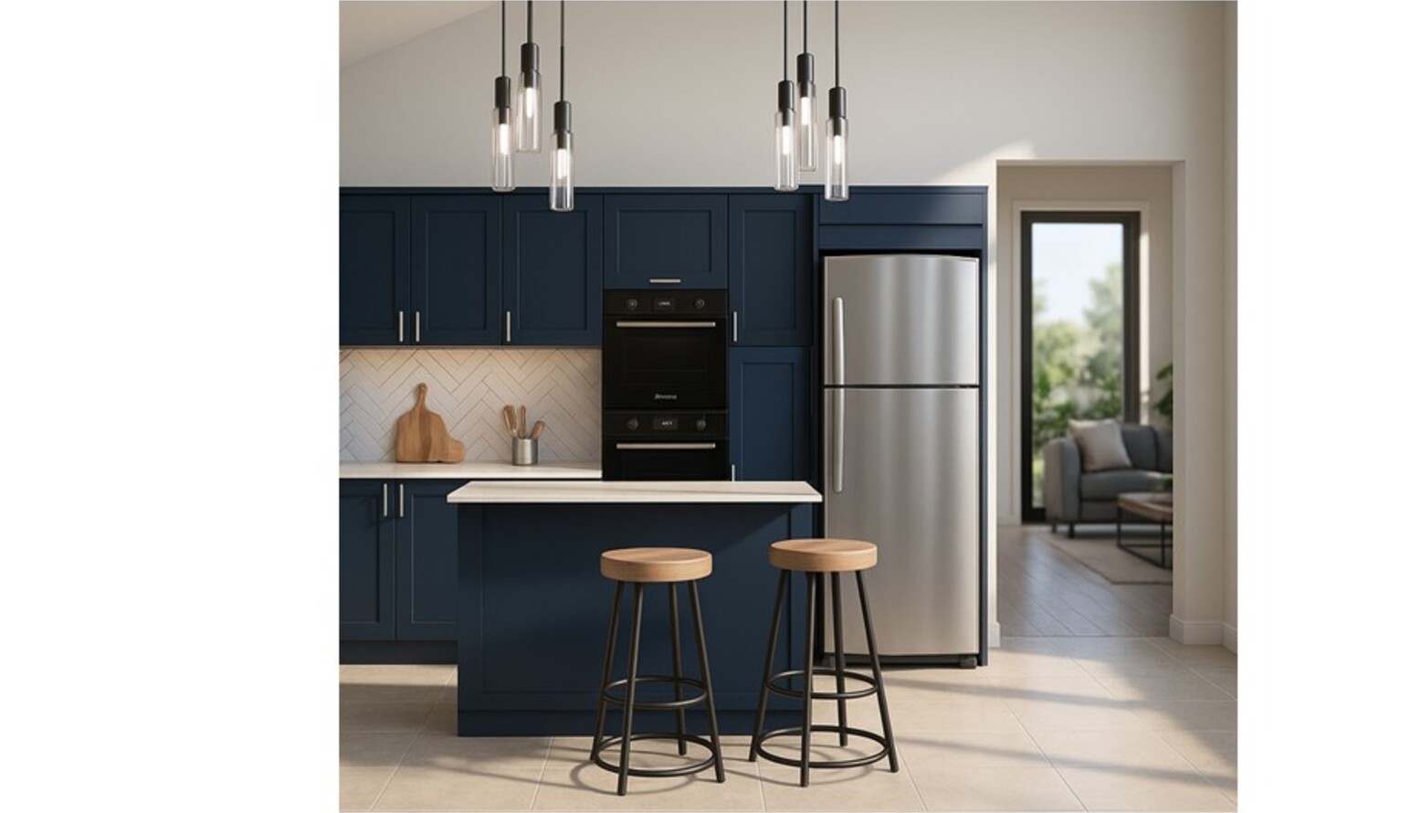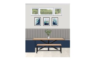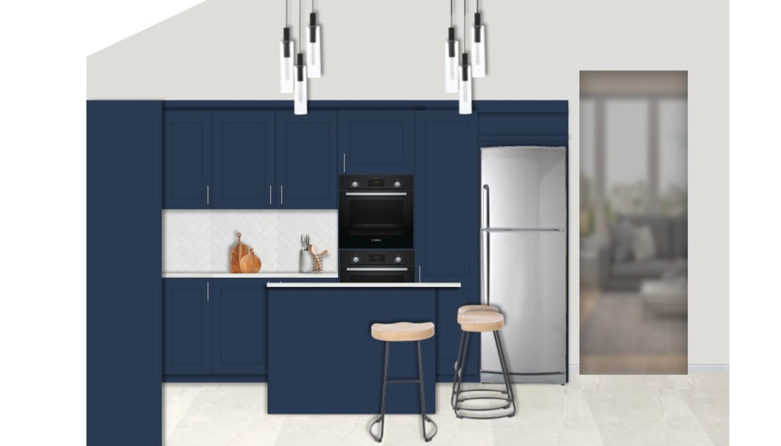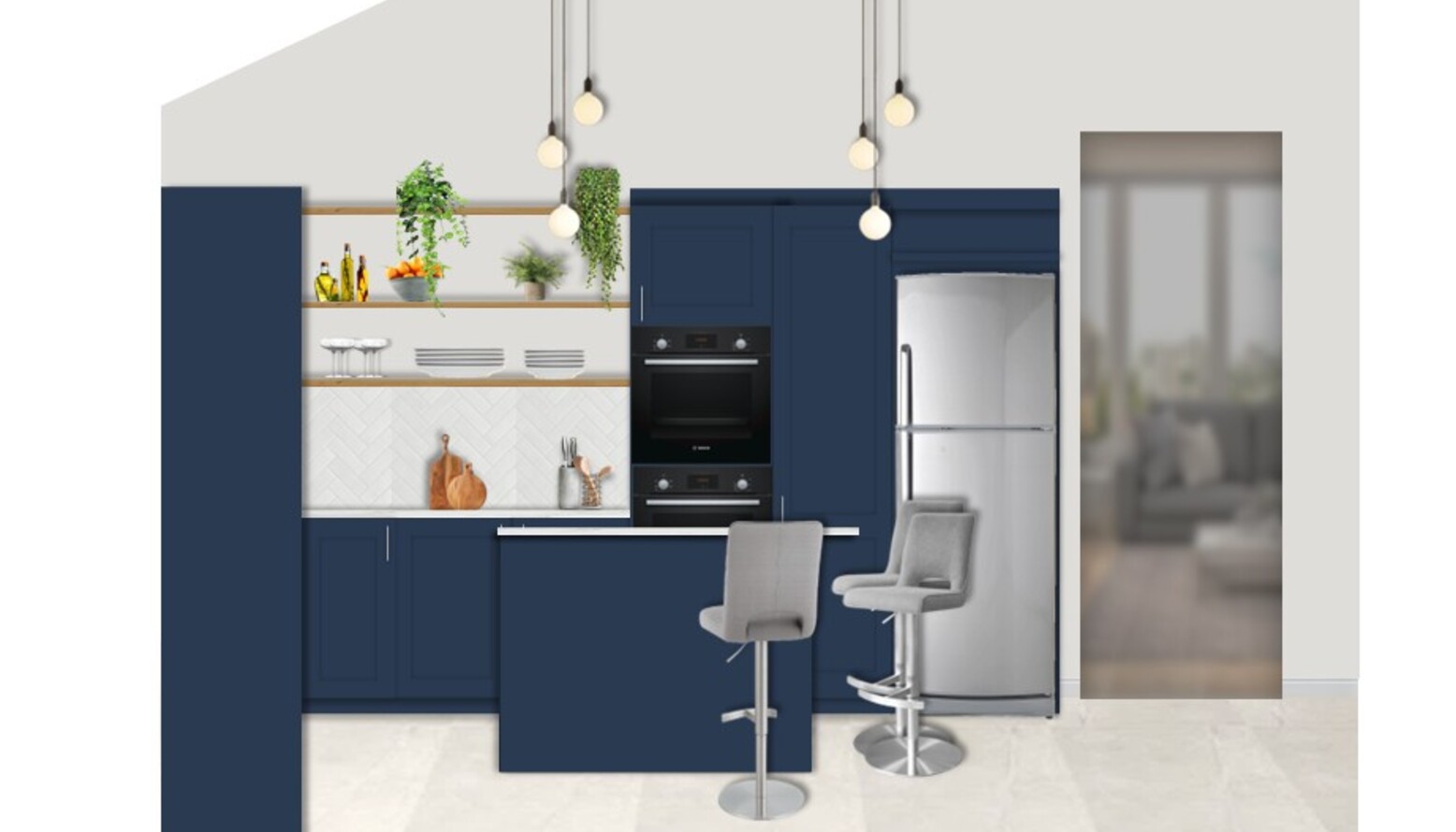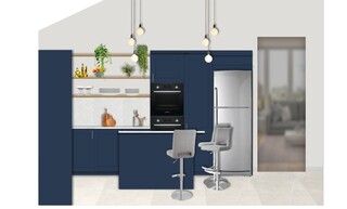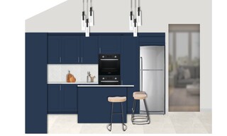 This inviting kitchen dining area features a stunning combination of deep navy cabinetry and a light-colored countertop, creating a striking contrast. The herringbone tiled backsplash draws attention and adds texture to the space. Above the island, sleek pendant lights with clear glass shades provide ample illumination, bringing a modern touch. The centerpiece is an island with a subtle marble effect, perfect for food preparation or casual dining. Accompanying the island are stylish bar stools, showcasing a blend of natural wood and black metal, which add both comfort and sophistication. The overall design is balanced with elements of greenery, such as the faux Ficus tree placed thoughtfully in the corner, bringing a fresh and lively atmosphere. Additional decor includes a framed canvas print that adds artistic flair, as well as carefully chosen accessories to elevate the aesthetic. The dining area enhances the space, inviting family and friends to gather and enjoy meals together. Large windows allow for natural light, making the room feel bright and airy, while the open layout seamlessly connects the kitchen to the adjacent living area, ensuring a warm and welcoming environment.