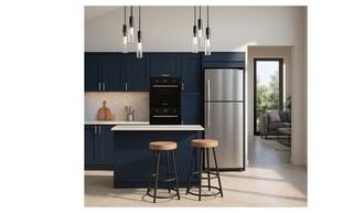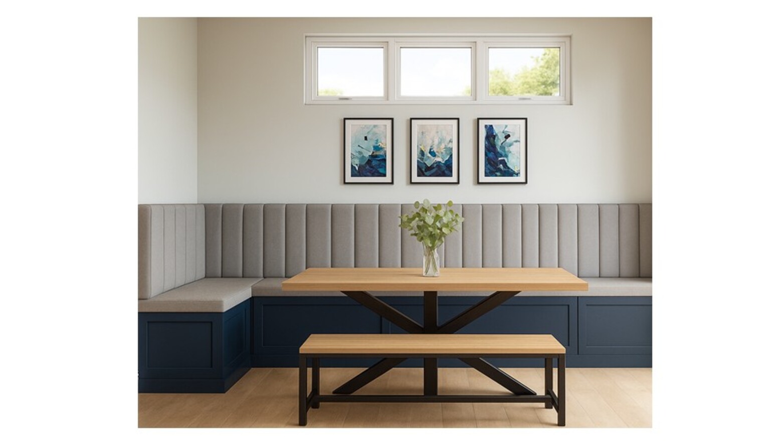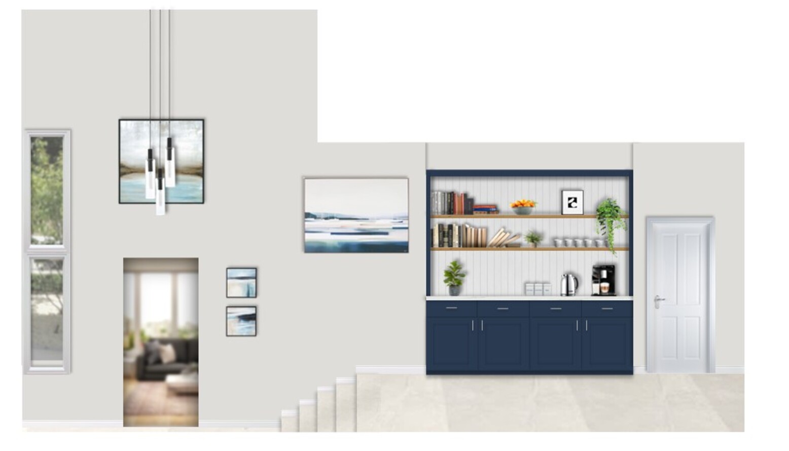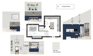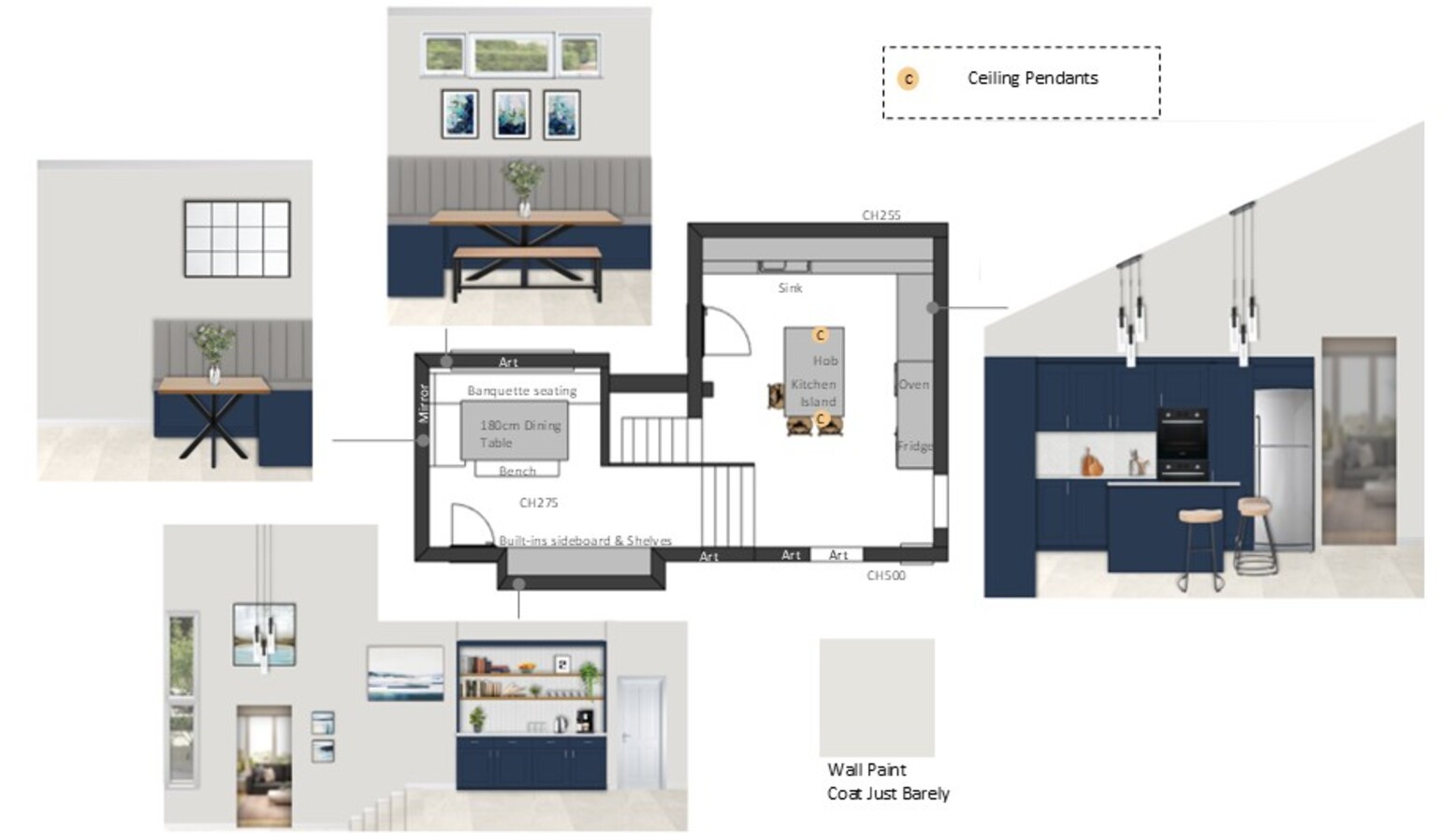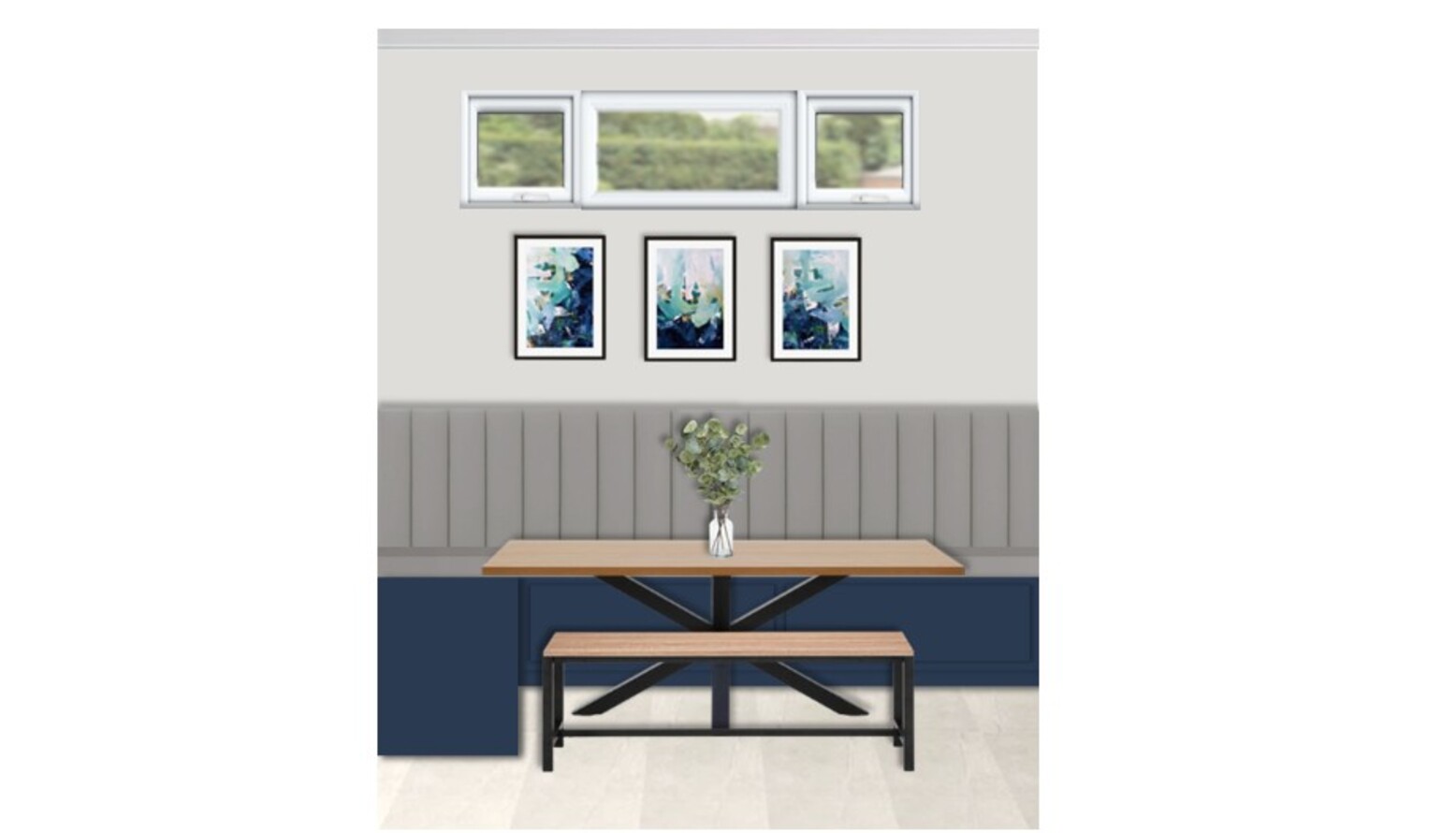 This inviting kitchen dining area features a stunning combination of deep navy cabinetry and a light-colored countertop, creating a striking contrast. The herringbone tiled backsplash draws attention and adds texture to the space. Above the island, sleek pendant lights with clear glass shades provide ample illumination, bringing a modern touch. The centerpiece is an island with a subtle marble effect, perfect for food preparation or casual dining. Accompanying the island are stylish bar stools, showcasing a blend of natural wood and black metal, which add both comfort and sophistication. The overall design is balanced with elements of greenery, such as the faux Ficus tree placed thoughtfully in the corner, bringing a fresh and lively atmosphere. Additional decor includes a framed canvas print that adds artistic flair, as well as carefully chosen accessories to elevate the aesthetic. The dining area enhances the space, inviting family and friends to gather and enjoy meals together. Large windows allow for natural light, making the room feel bright and airy, while the open layout seamlessly connects the kitchen to the adjacent living area, ensuring a warm and welcoming environment.