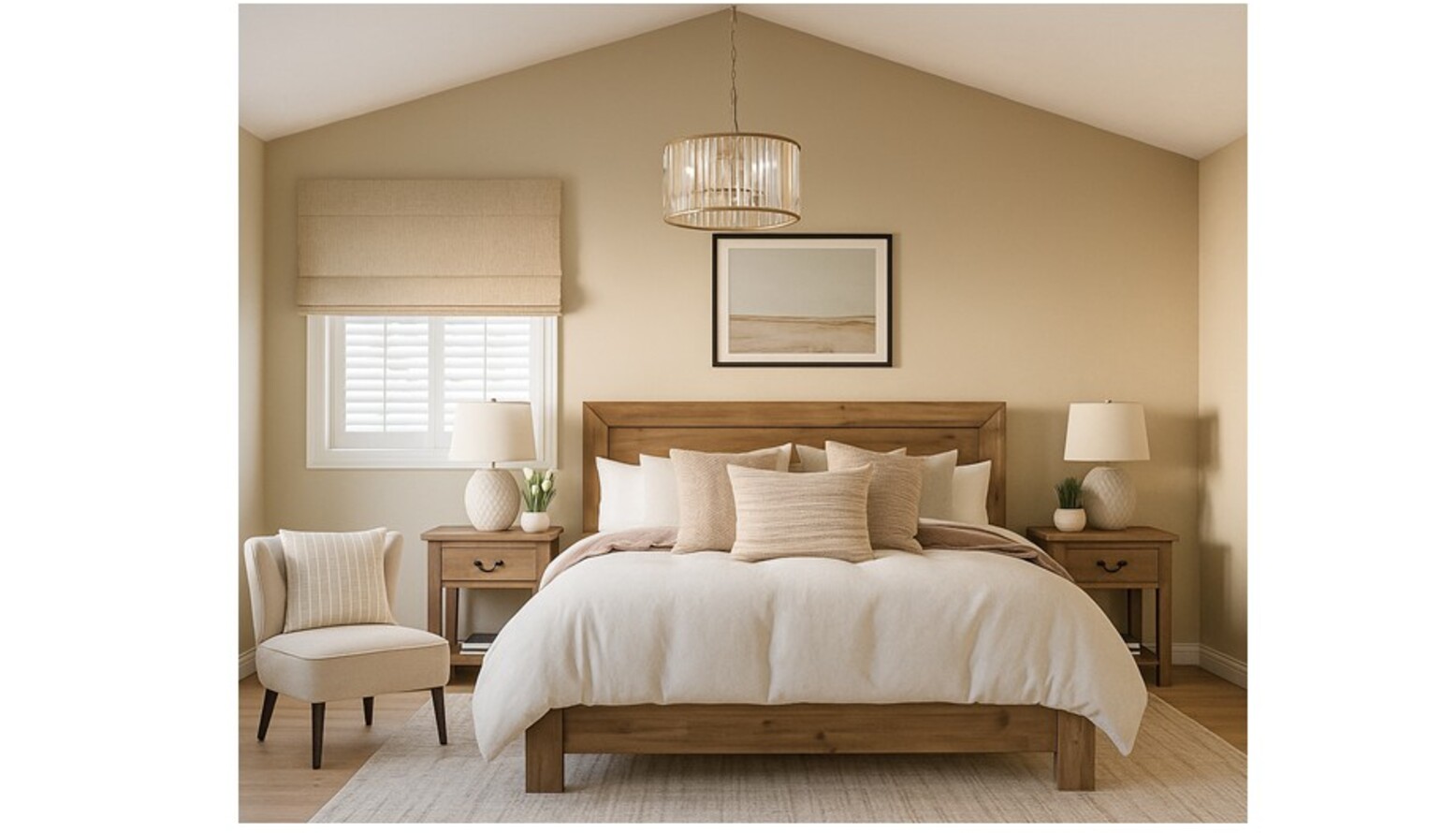 The bedroom features a calming palette with warm neutral tones that create a cozy atmosphere. A stunning super king bed, adorned with a natural-colored bedspread, serves as the focal point of the space. The bed is layered with a variety of cushions in soft taupe and cream shades that provide comfort and style.