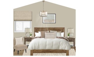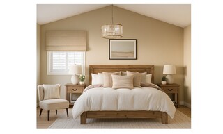 At the foot of the bed lies a luxurious wool rug, providing texture and comfort underfoot. Wall art in soft colors complements the overall design without overpowering it, while the inclusion of greenery, through faux plants in ceramic pots, adds a touch of life to the decor.