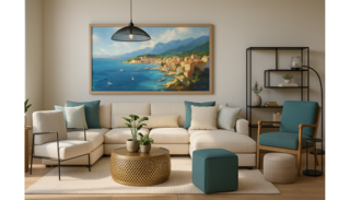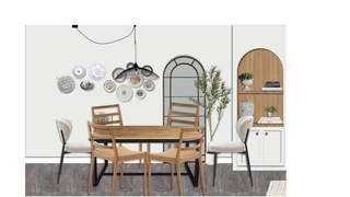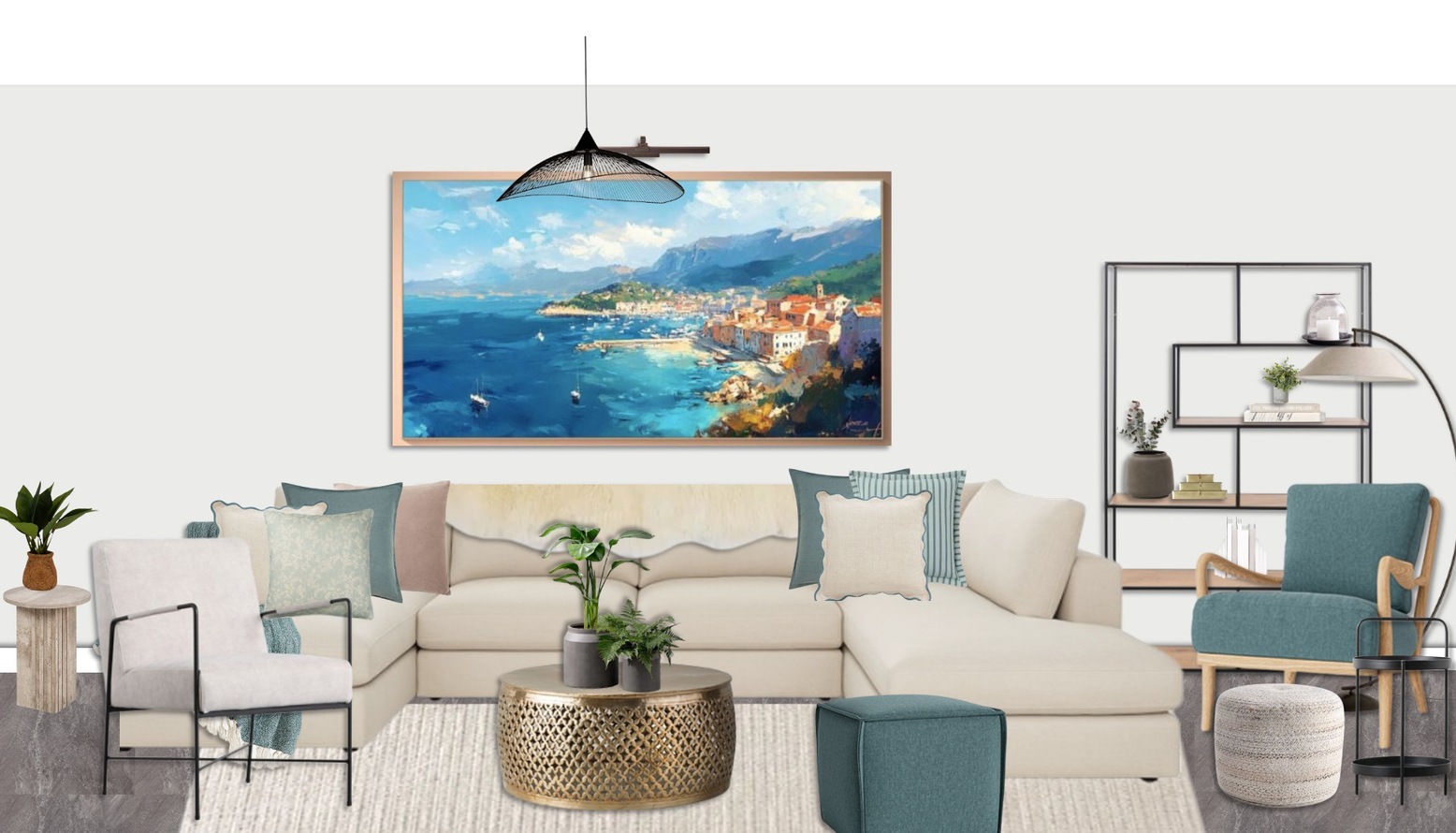 This dual-function living and dining room elegantly combines comfort and style. The spacious layout features a large sectional sofa in a soft, neutral fabric, adorned with various cushions in heritage grey and teal shades, creating a cozy atmosphere. In the center, a decorative coffee table with a stylish metallic finish offers a focal point for both relaxation and entertaining.