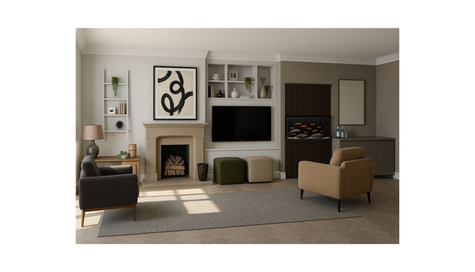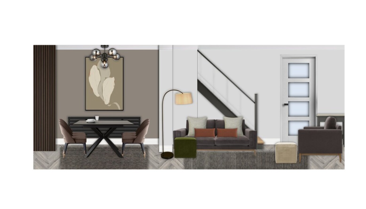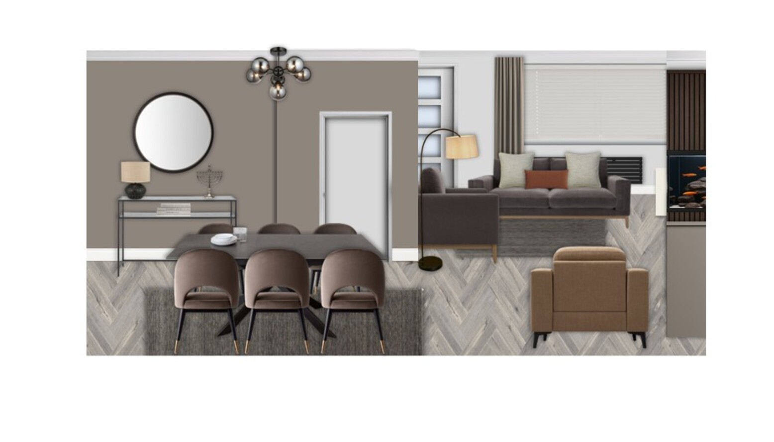 This dual-function living and dining area combines comfort and style with a warm, inviting ambiance. Central to the space is a cozy seating arrangement featuring two elegantly upholstered sofas in shale, creating a harmonious atmosphere. The darker tones of the Costello sofas provide a lovely contrast against the lighter elements of the room. A pair of contrasting cushions from Andrew Martin adds a touch of texture and visual interest. Adjacent to the seating area is a sleek dining setup, anchored by a sophisticated dark grey ceramic table that can accommodate up to eight guests. Surrounding this table are elegant mocha velvet dining chairs with bronze legs, offering comfort and chic styling for meal times. The decor is further enhanced by a selection of art pieces, including a bold, framed print that introduces graphic flair to the wall, while a stylish mirror adds depth and light to the room. Natural elements are seamlessly integrated, with stylish faux plants and a cozy wool rug layered beneath the seating area, providing warmth and softness. The room features a soothing palette of warm earth tones and light greys, enhanced by carefully chosen paint samples from The Little Greene Paint Company. Lighting is thoughtfully incorporated with a mix of tabletop and floor lamps, ensuring the space is well-lit at any hour, while an elegant ceiling light fixture acts as a statement piece above the dining area. Storage needs are met with a tasteful console table, blending functionality with aesthetic charm, complemented by decorative accessories that carry the room’s design narrative throughout.