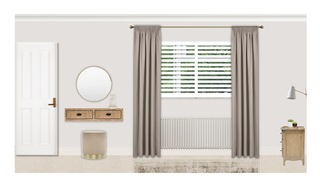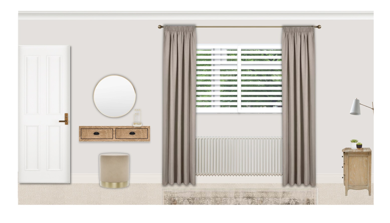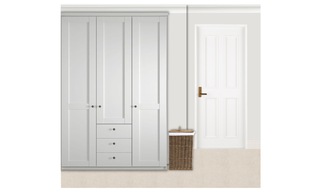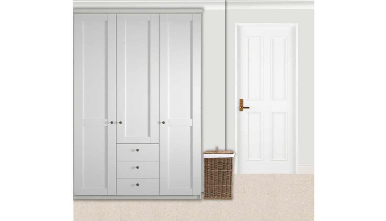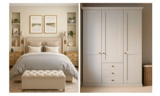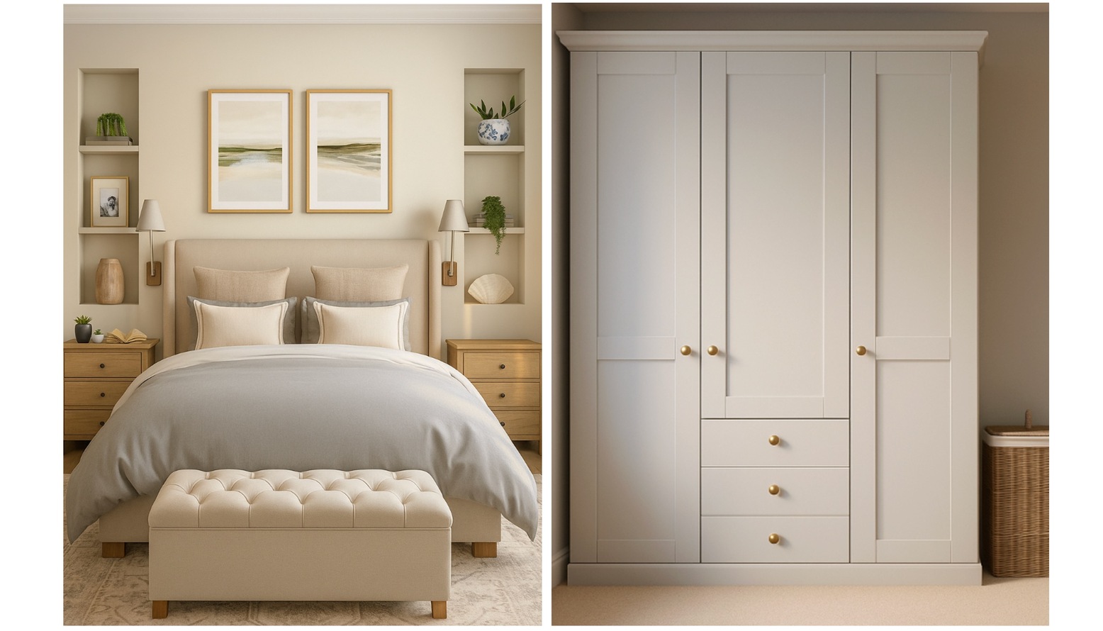 Across the room, a tall, understated wardrobe in an off-white finish features a combination of hinged doors and drawers, providing ample storage while maintaining a minimalist aesthetic. This is accentuated by brass hardware that adds a hint of elegance.