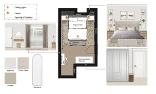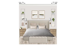 Artistic elements include framed prints mounted above the bed, evoking a serene landscape, which harmonizes beautifully with the room's color scheme. A pair of chic wall lights are mounted beside the bed, offering both illumination and a touch of sophistication.