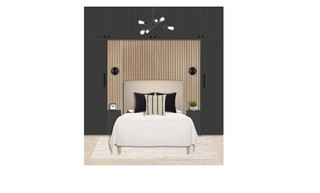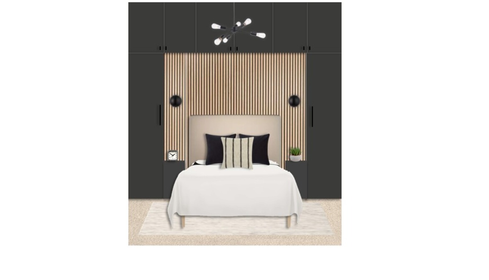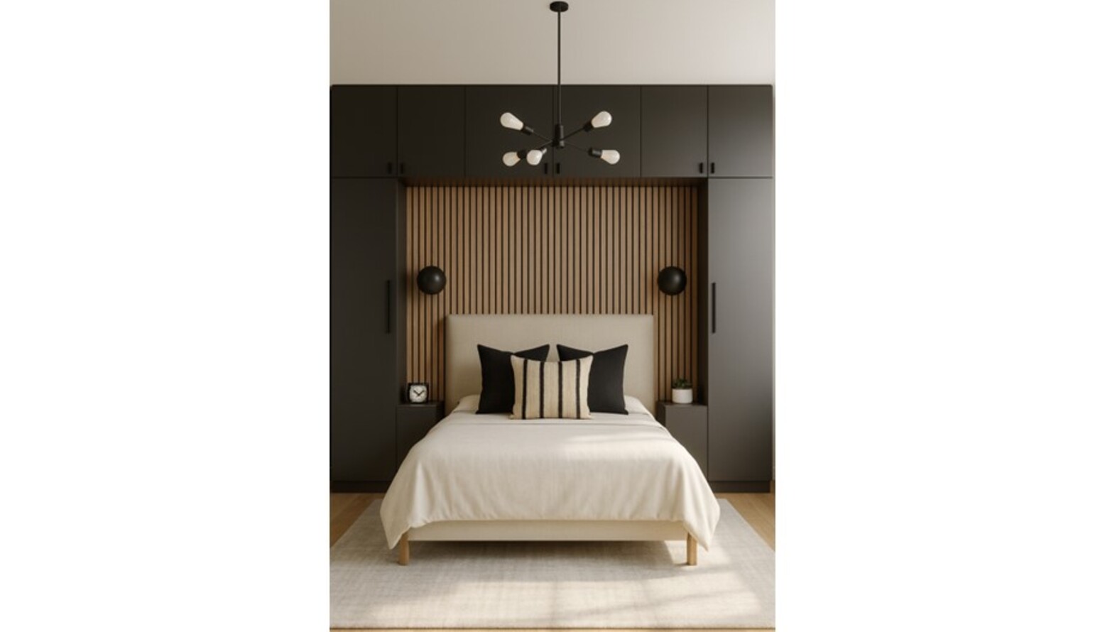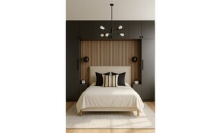 The bedroom design showcases a sophisticated blend of modern aesthetics and functional elements. A small double upholstered bed frame, draped in a soft beige fabric, takes center stage, complemented by a plush duvet. At the headboard, a striking feature wall with vertical wooden slats adds texture and depth. On either side of the bed, sleek dark cabinetry offers ample storage while maintaining a streamlined look. Each bedside table has a minimalist design and houses stylish table lamps for ambient lighting.