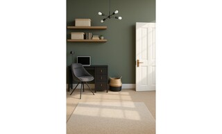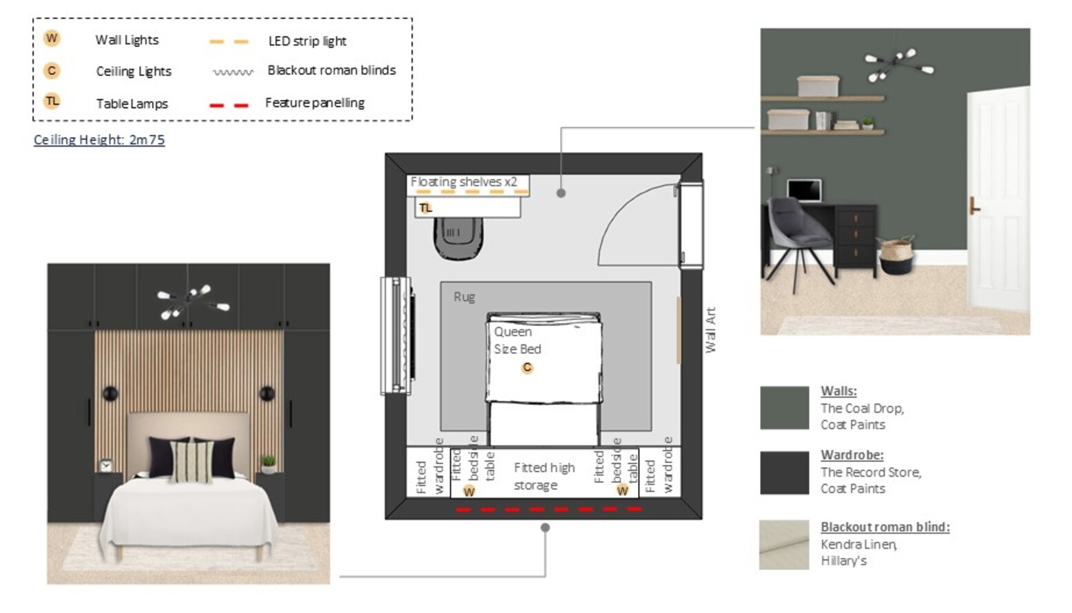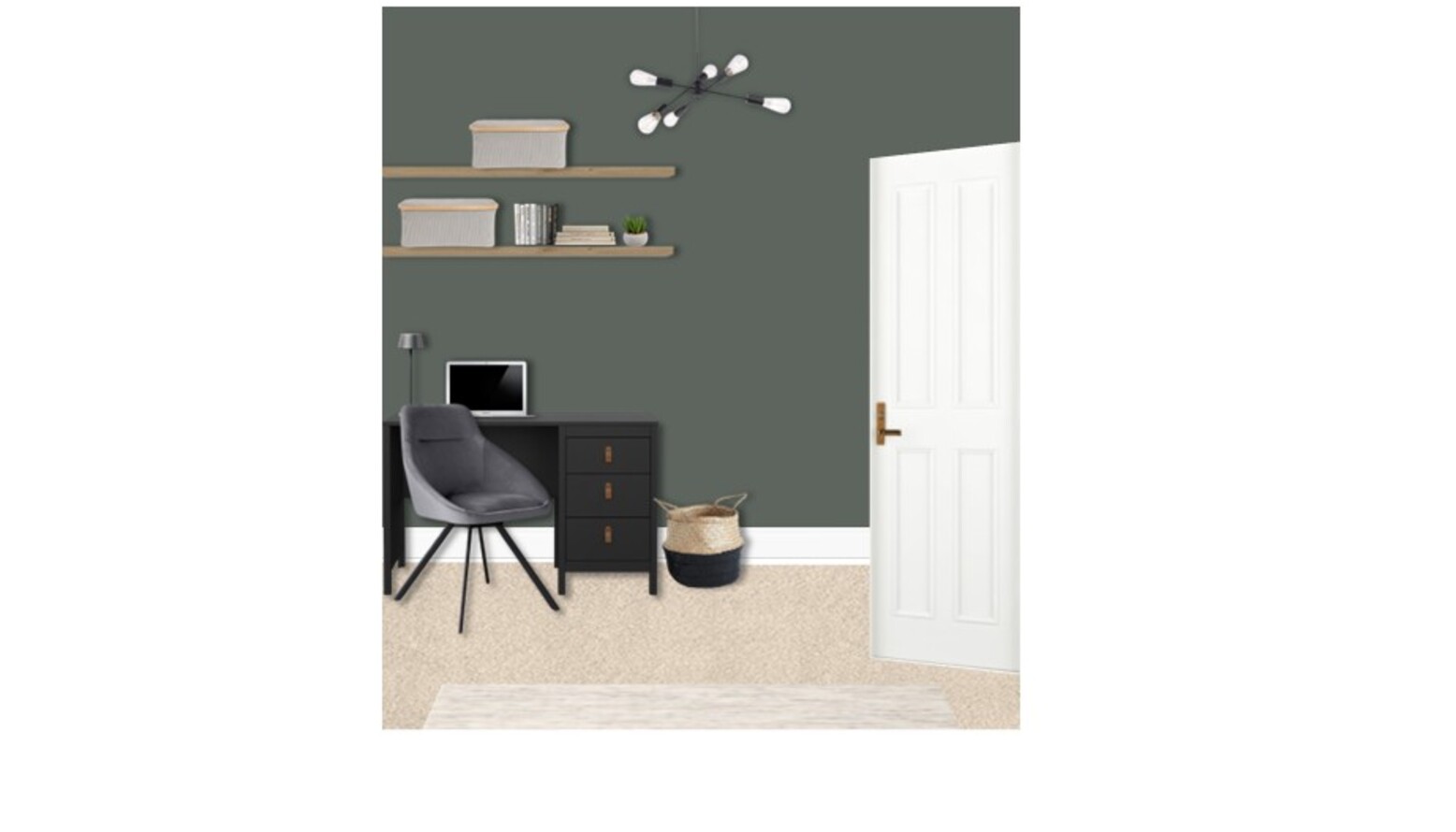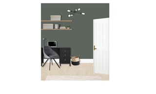 A functional workspace is integrated within the design, featuring a black desk with three drawers, offering practicality without compromising aesthetics. A chic swivel chair in dark grey velvet adds an elegant pop of color, creating a perfect corner for productivity. Wall-mounted shelving in artisan oak displays curated artwork and personal items, enriching the room's character.