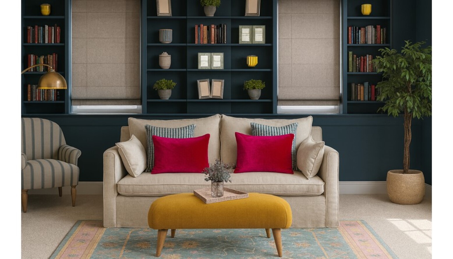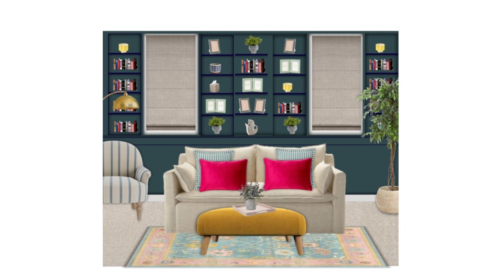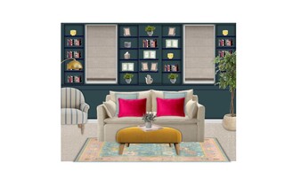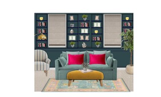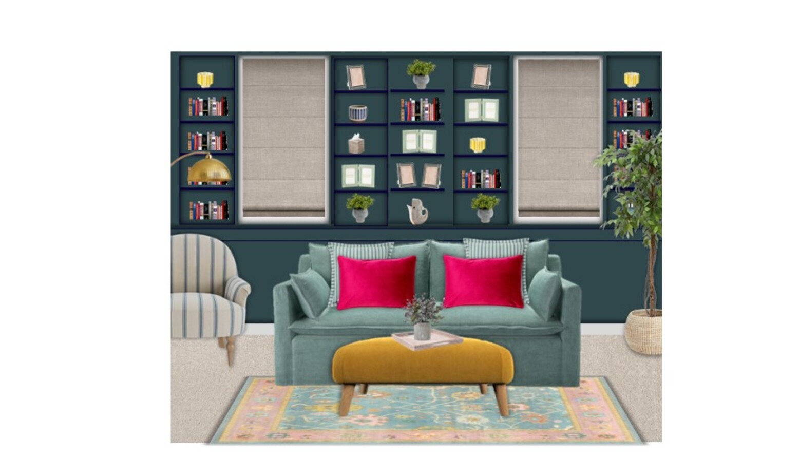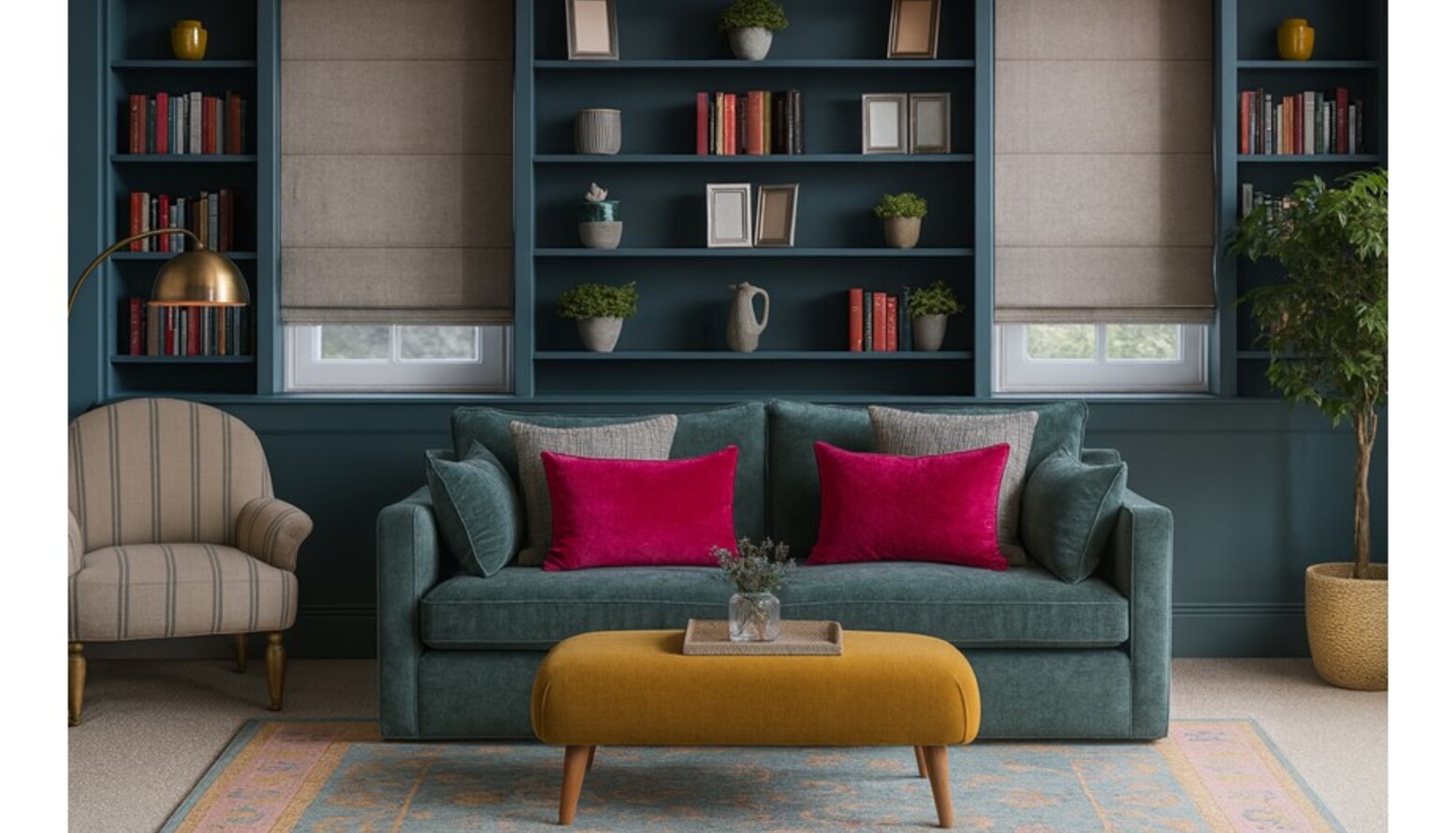 The shelving unit, painted in the same teal color, is filled with an array of books and decorative items, showcasing personal style and interests. Foliage is introduced through an artificial eucalyptus plant and a striking ficus tree, bringing an organic element to the design.