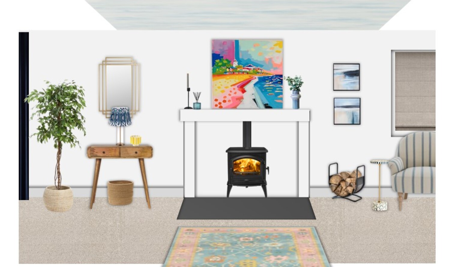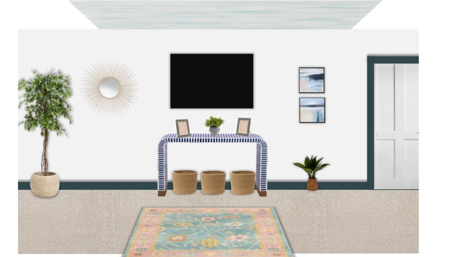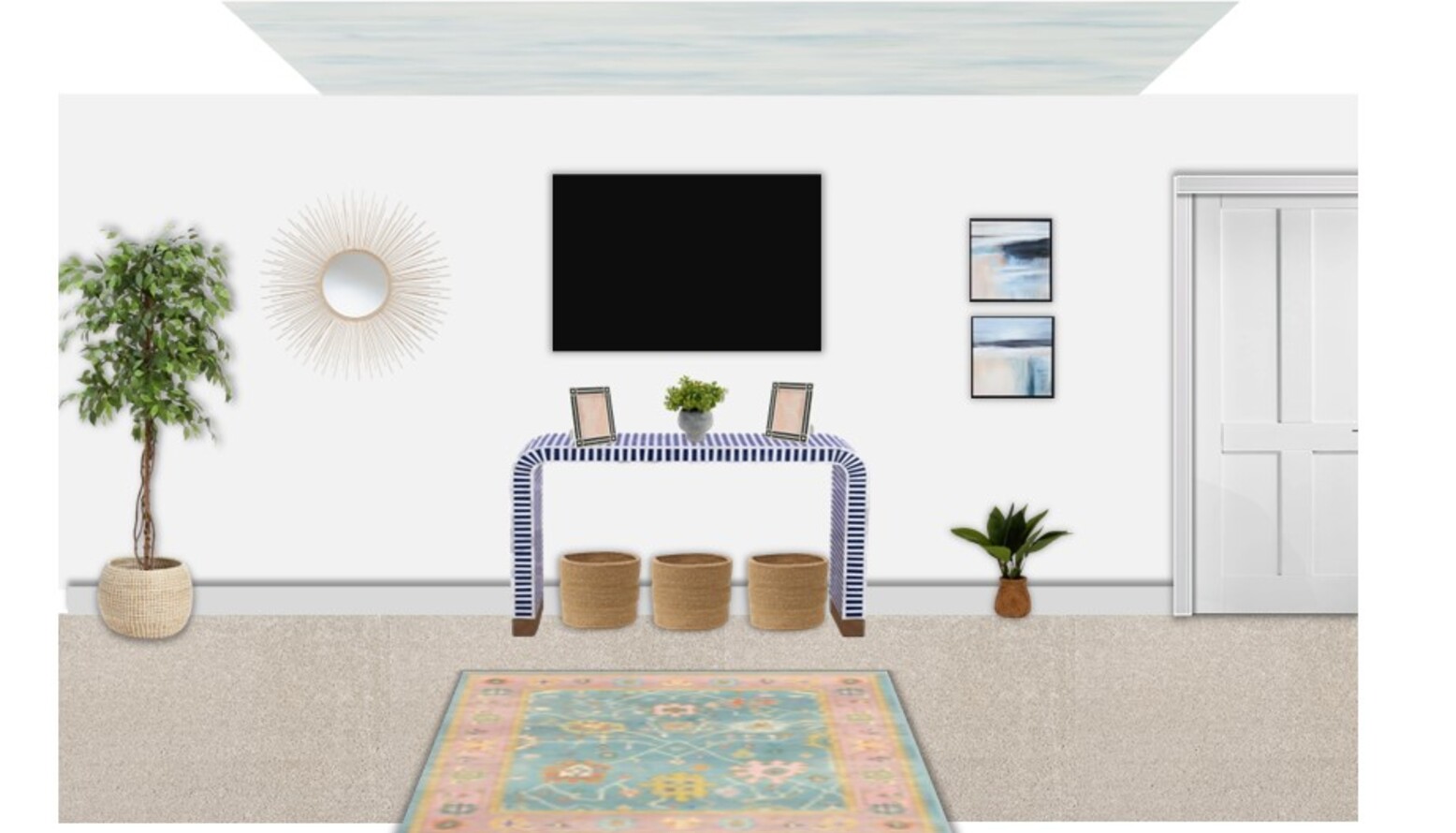 The layered flooring is enhanced by a multicolored flatwoven rug, framed by a natural ribbed basket that adds texture and practicality. A pair of gold metal Art Deco mirrors decorates the walls, reflecting light and enhancing the room's spacious feel.