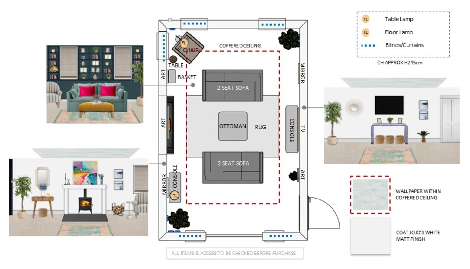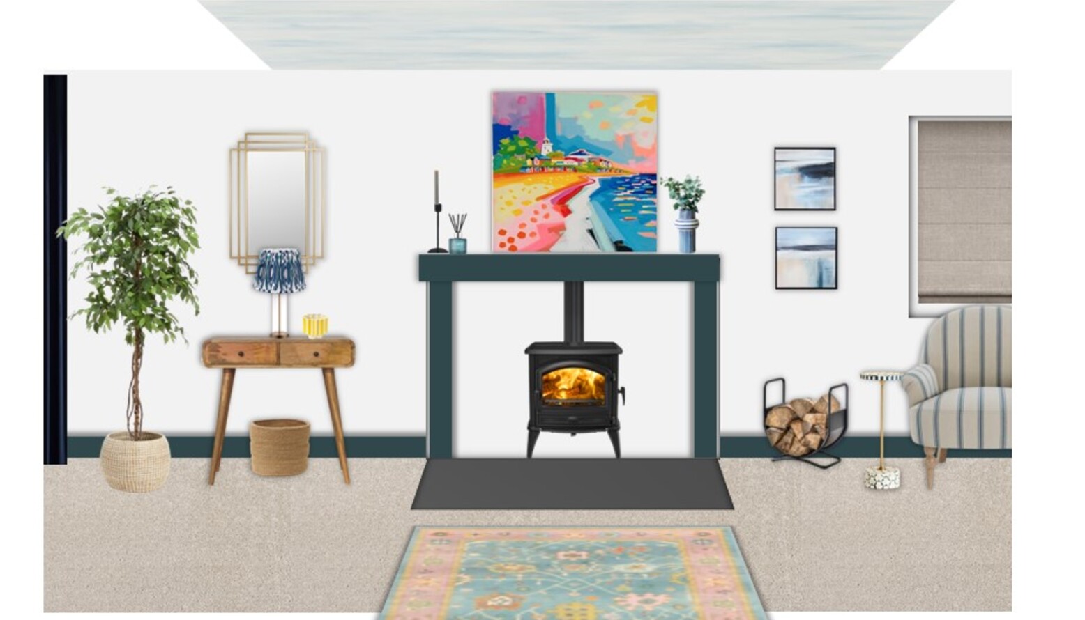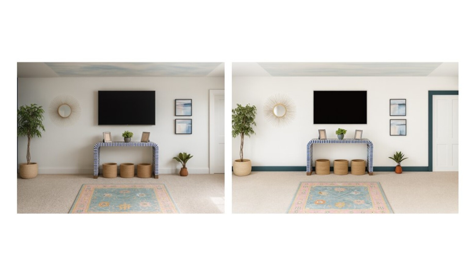 The layered flooring is enhanced by a multicolored flatwoven rug, framed by a natural ribbed basket that adds texture and practicality. A pair of gold metal Art Deco mirrors decorates the walls, reflecting light and enhancing the room's spacious feel.